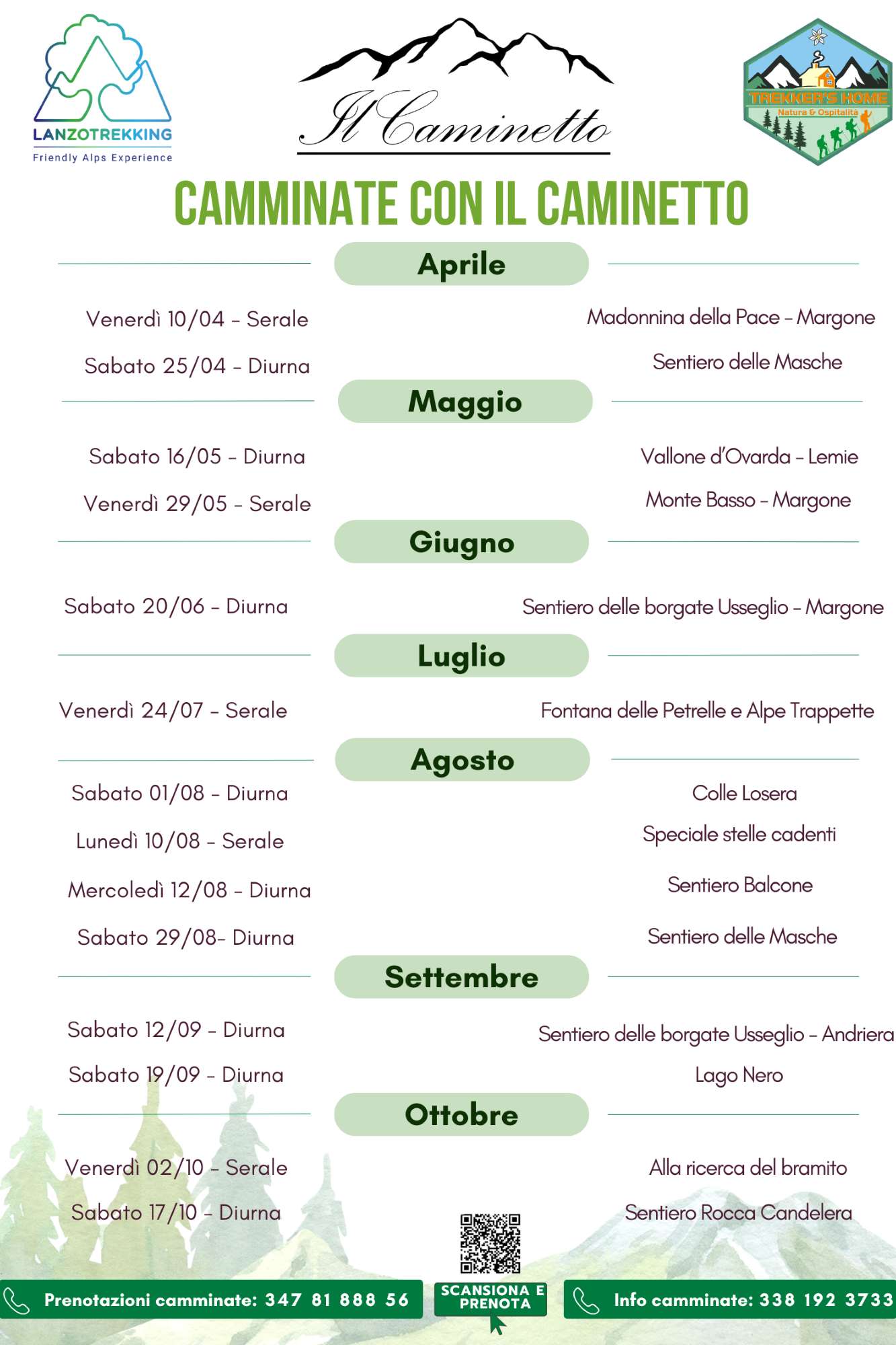 In collaborazione con le guide escursionistiche GAE Lanzotrekking (Andrea Mantelli) e Trekker’s Home (Laura Grosa e Alessandro Vangi), il ristorante Caminetto di Margone propone al suo pubblico, dopo le ciaspolate, numerosi appuntamenti da aprile a ottobre sui sentieri di Usseglio.