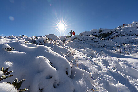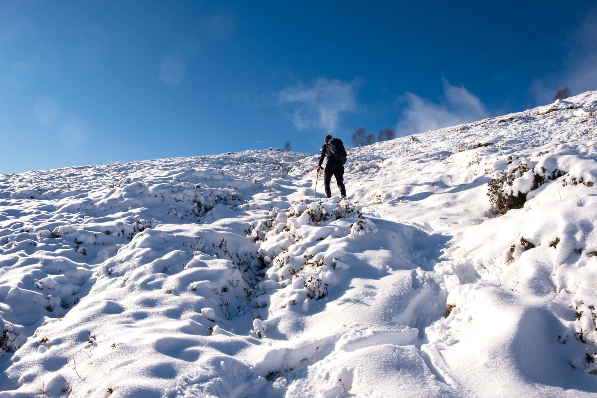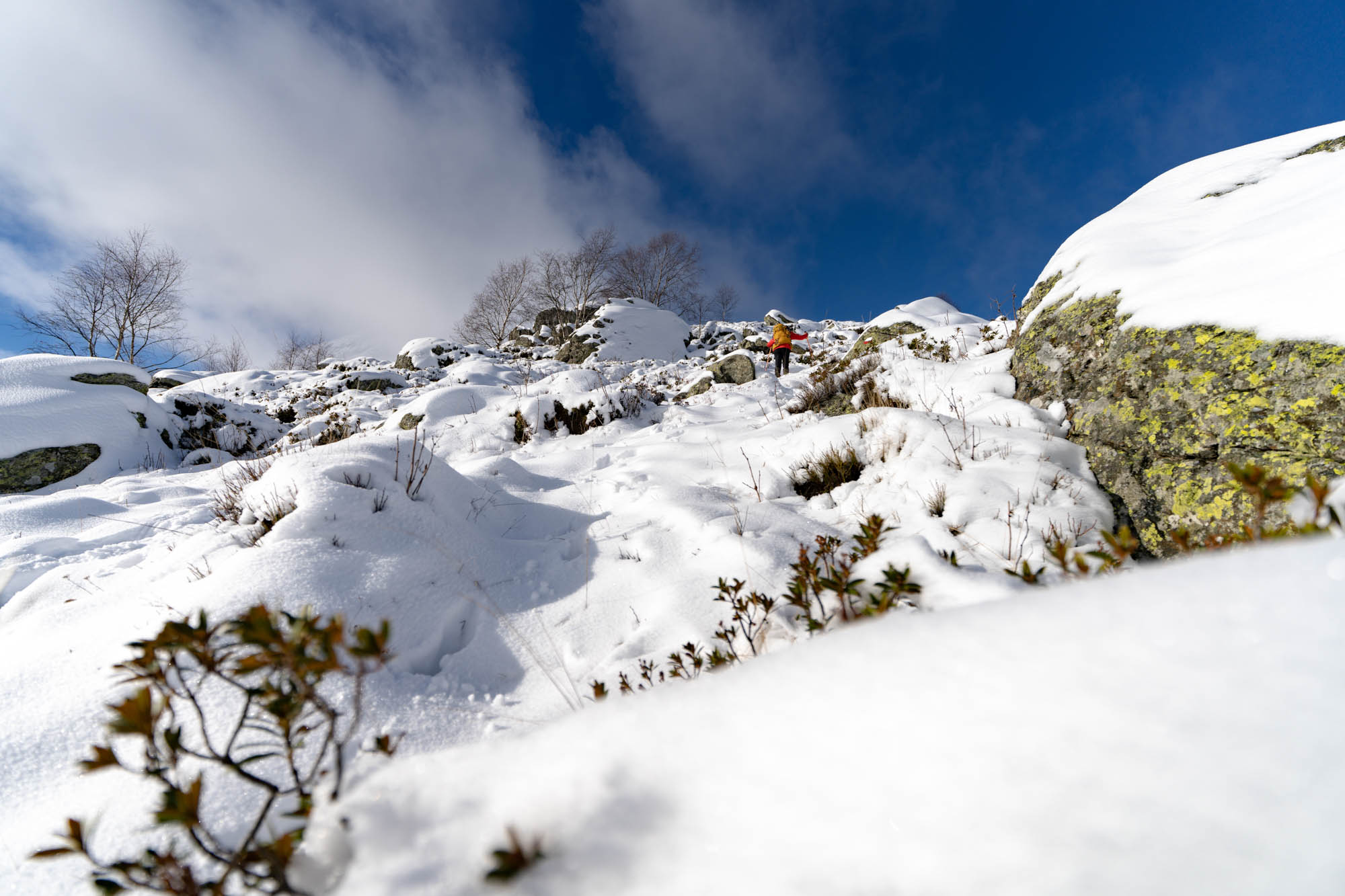 The route briefly levels out through sparse birches before rising again across open terrain. At the second shoulder (1,718 m), turn sharply right toward the now-visible summit, approaching from the north.