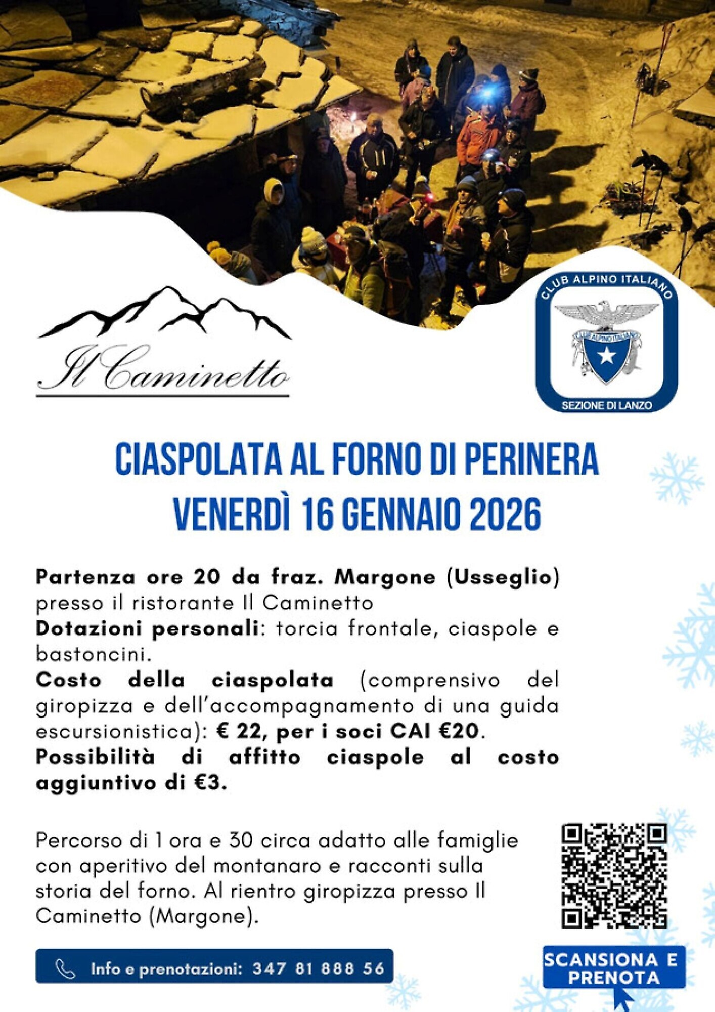 Il costo della ciaspolata è di 22€, 20€ per i soci CAI. Possibilità di noleggio ciaspole a 3€. Incluso nel prezzo della partecipazione giropizza al rientro dell’escursione presso Il Caminetto.