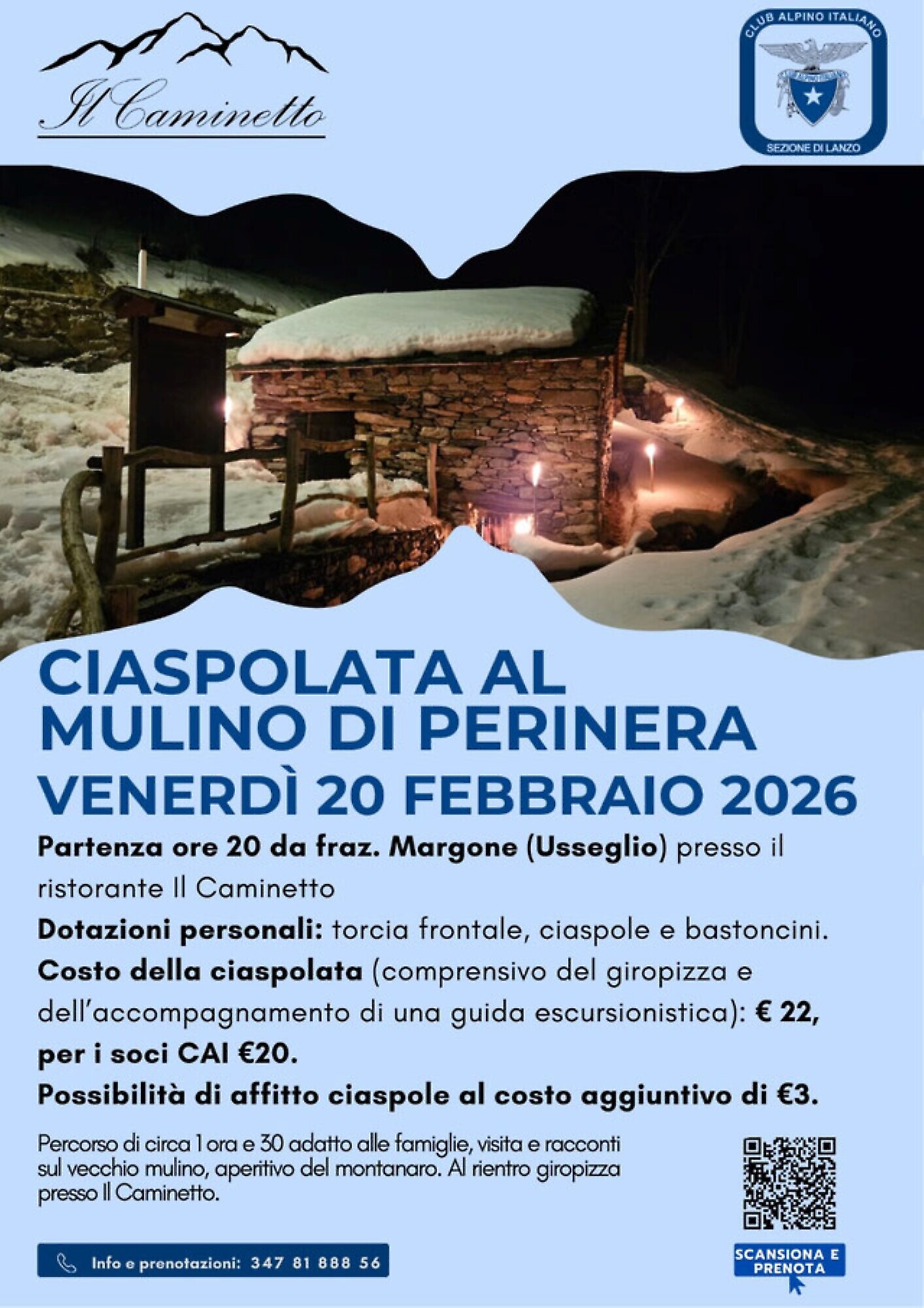 Venerdì 20 febbraio, alle ore 20, una semplice passeggiata tra le borgate innevate di Usseglio vi condurrà al mulino di Perinera.