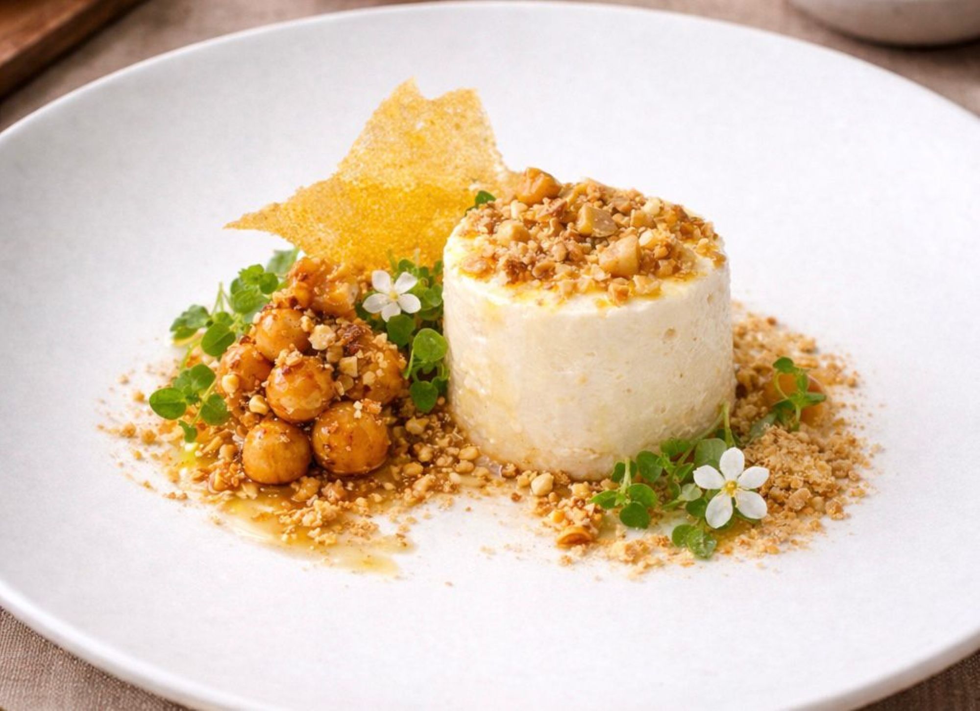 L’inizio: Robiola di montagna, miele di castagno, nocciola Piemonte abbinato a Metodo Classico