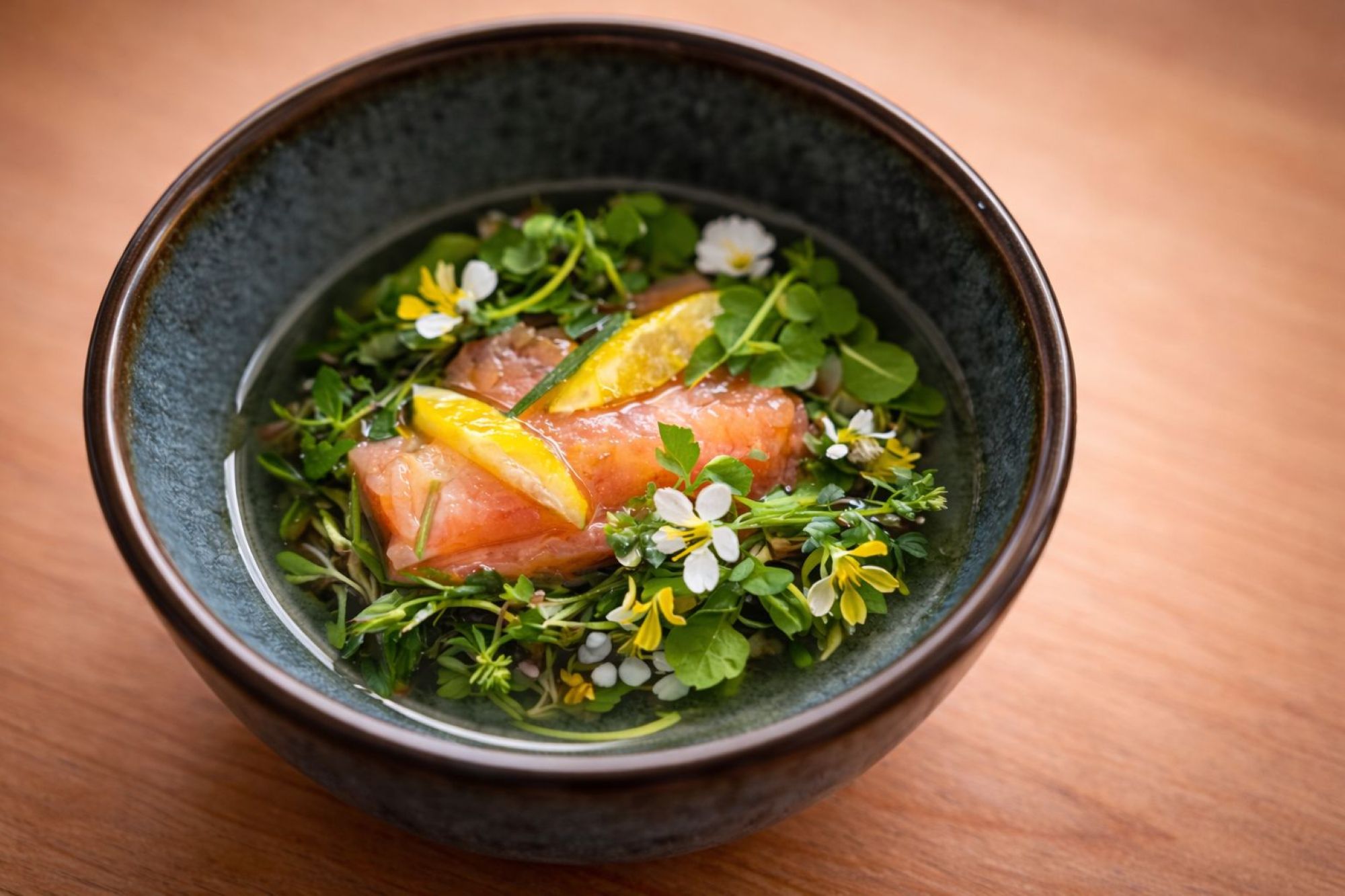 L’acqua del torrente: trota marinata, erbe spontanee, limone abbinato a Roero Arneis