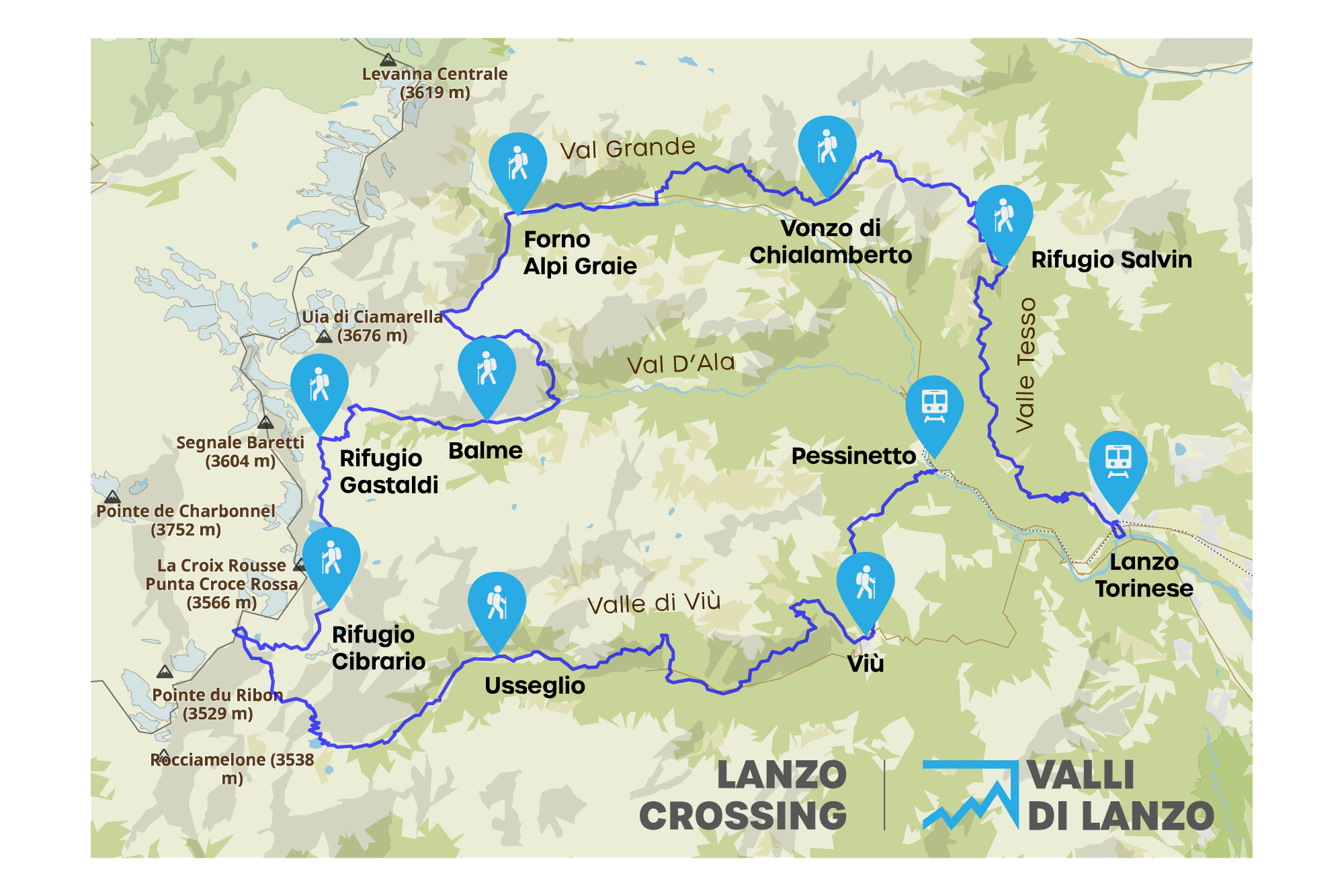 Lanzo Crossing è una traversata che unisce nel suo sviluppo ben quattro differenti valli: Val di Tesso, Valle di Viù, Val d’Ala e Val Grande. Si tratta di un trekking che consente di attraversare tutti gli ambienti che le Valli di Lanzo sanno offrire: dalle borgate storiche ai boschi di bassa e media montagna, dai lariceti in quota fino ai laghi alpini, superando colli di oltre 3.000 metri e camminando al cospetto delle imponenti cime che separano le varie valli. Un itinerario alternativo alla GTA, che ha il grande vantaggio di chiudersi ad anello e che può essere percorso anche senza l'utilizzo dell'auto, grazie alla ferrovia che raggiunge comodamente le tappe di partenza e di arrivo.