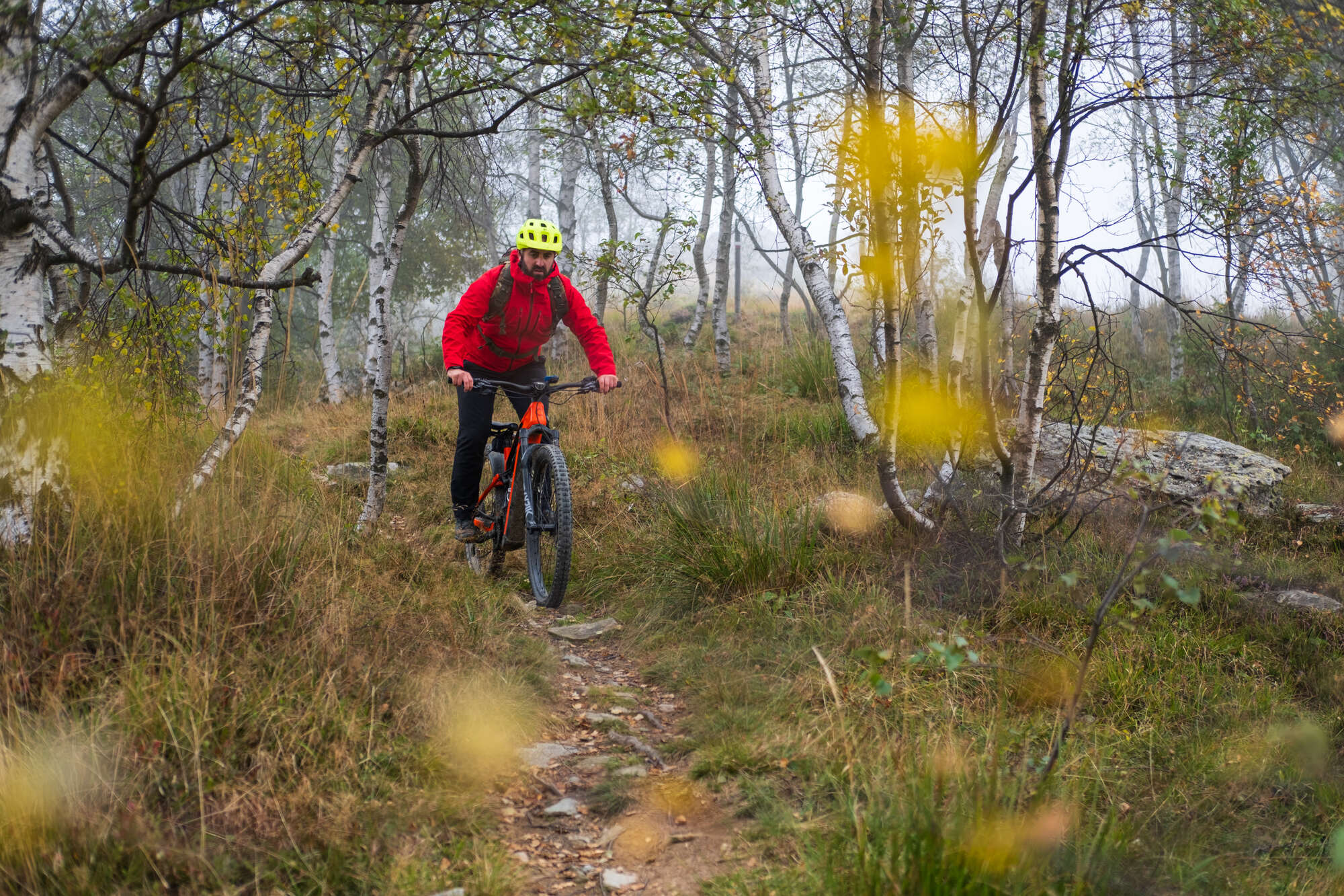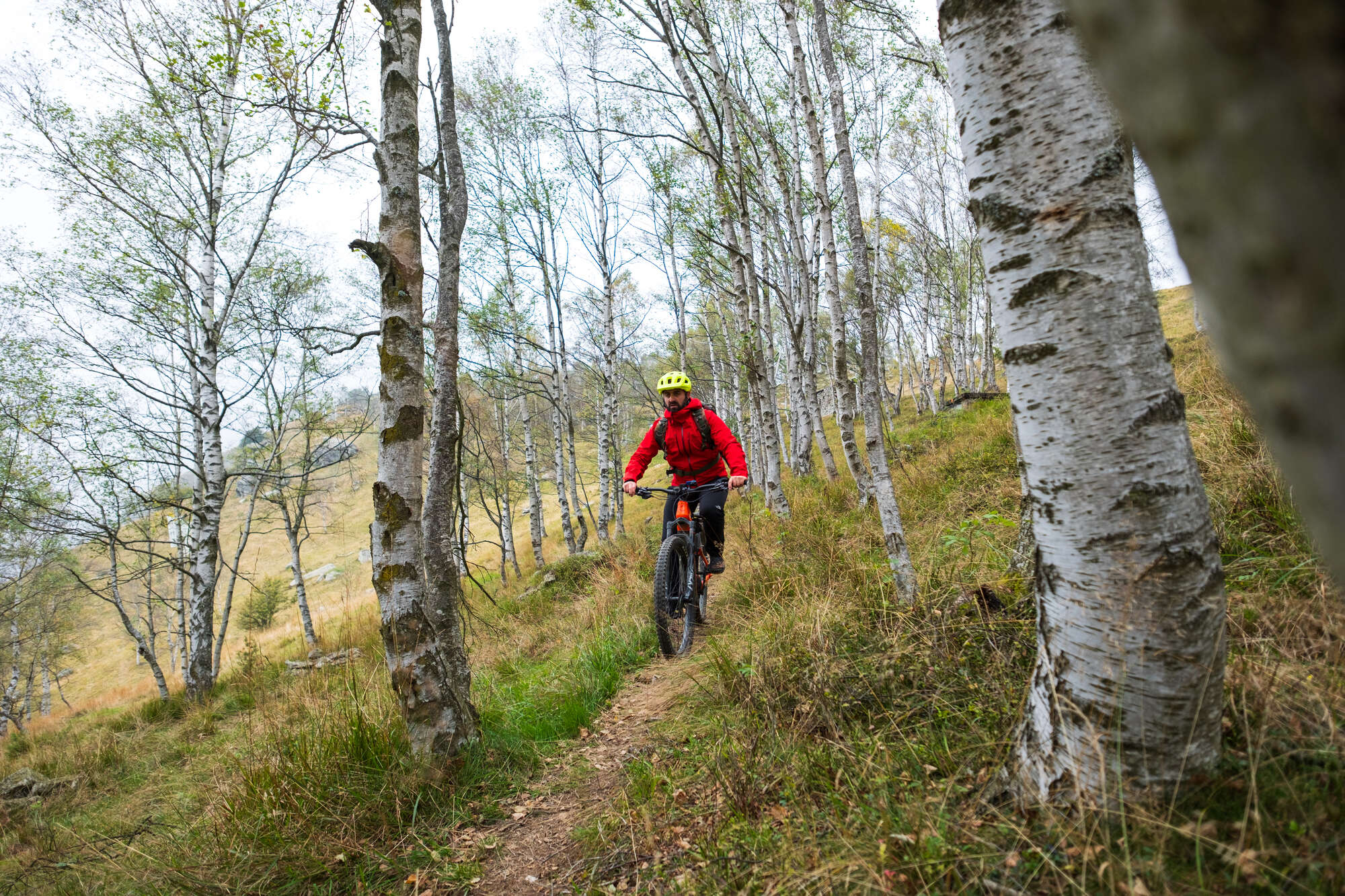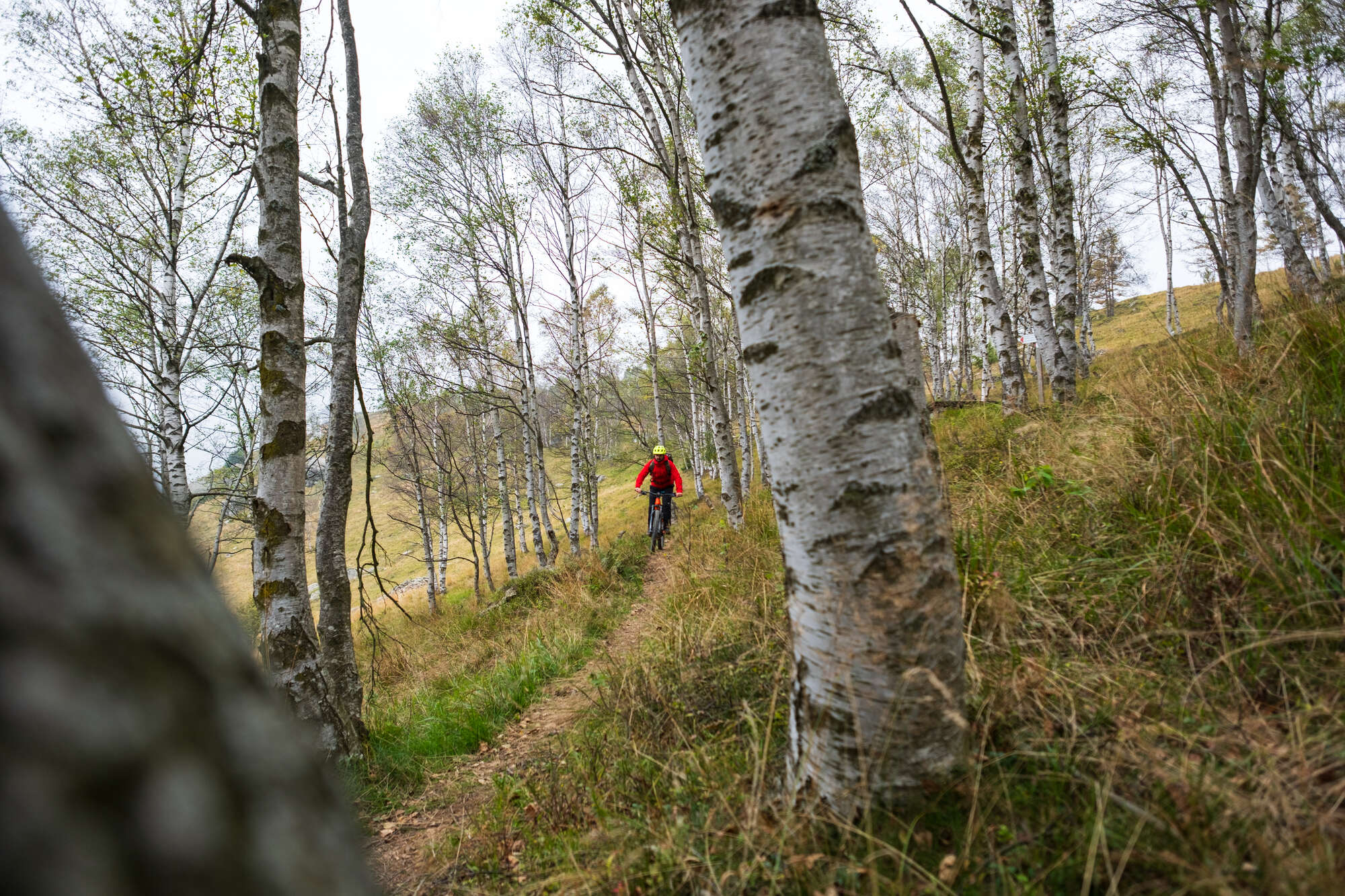 Per una discesa tranquilla si può ripercorrere lo stesso tragitto dell’andata. Chi invece desidera aggiungere un pizzico di adrenalina può percorrere al ritorno brevi single track che tagliano i tornanti (in tal caso la difficoltà diventa BC). Il primo si trova all’incirca a 1.600 m di quota, appena prima di tornare al colle della Forchetta, e presenta un’uscita un po’ tecnica. Il secondo parte proprio dal colle: occorre imboccare la sterrata chiusa da una sbarra diretta verso sud. Dopo duecento metri la si lascia per un bellissimo sentiero che si stacca a destra serpeggiando tra le betulle. Quando improvvisamente pare esaurirsi lo si riprende qualche metro più a monte per scendere nei pressi delle belle baite dell’alpe san Barbara (1.504 m, fontana). Prendere la sterrata inerbita di accesso che scende verso il colle di san Giacomo (1.460 m), dove si confluisce su una sterrata. Seguendola per un breve tratto verso sinistra intercettare un ultimo single track ancora a sinistra, molto divertente e con un’uscita un po’ tecnica. Tornati sulla strada non resta che seguirla a ritroso fino all’auto.