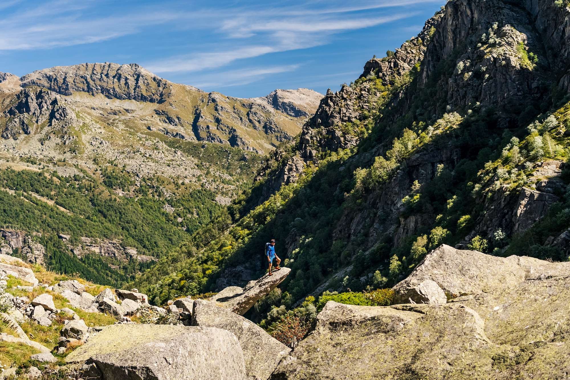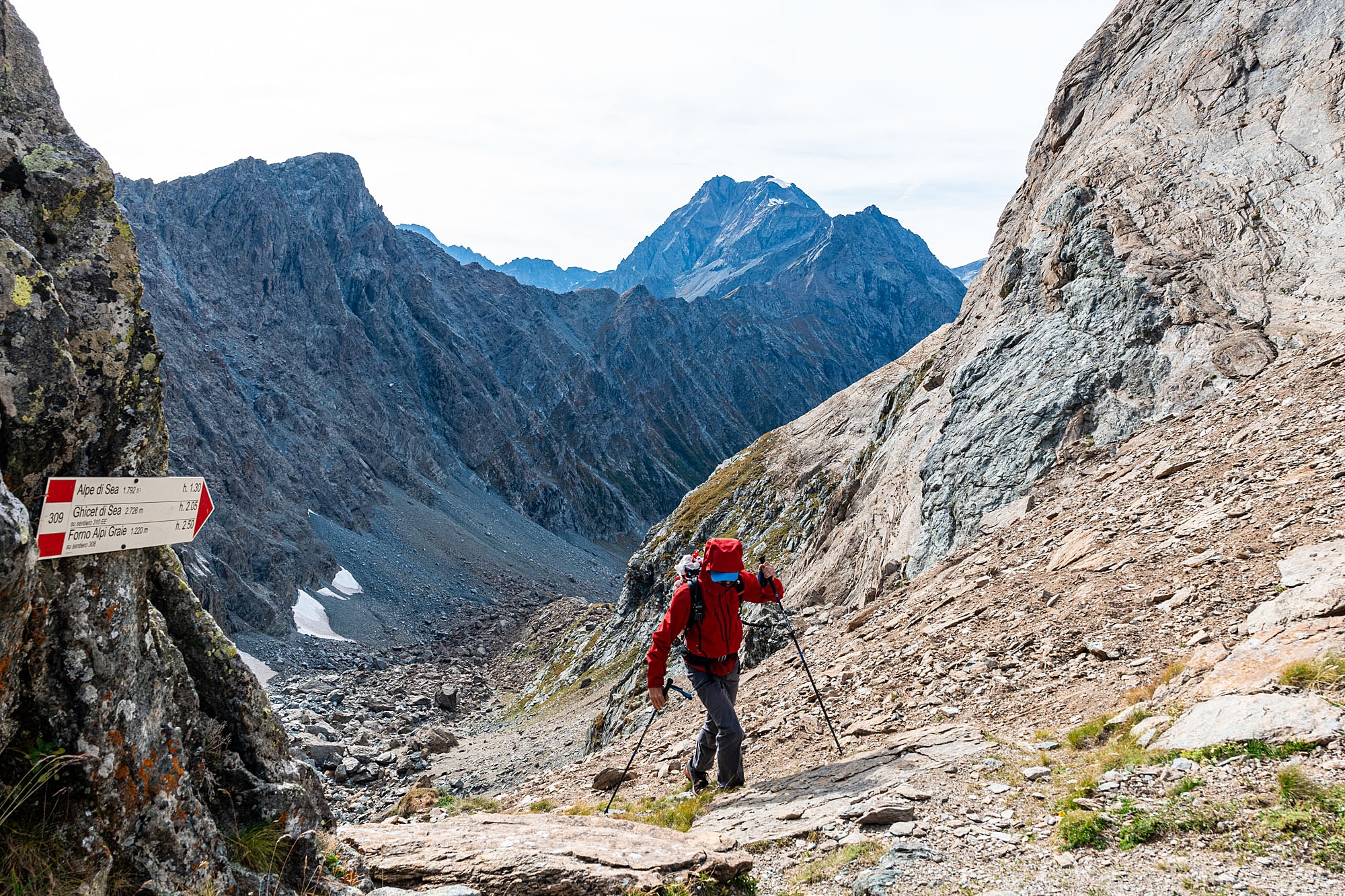 Poco oltre si attraversa il torrente in prossimità dell’alpeggio Balma Massiet, spostandosi sull’altro versante e proseguendo fino ad arrivare ad un bivio nelle immediate vicinanze di una passerella in legno che collega con l’Alpe di Sea. Qui si abbandona il sentiero principale che si inoltra nella parte alta del vallone per imboccare la traccia a sinistra (segnavia 309) e risalire il pendio verso il Passo dell’Ometto (2.614 mt). Questo tratto di sentiero può essere disagevole nella parte bassa a causa della vegetazione, mentre la salita al passo è ripida e su sfasciumi.