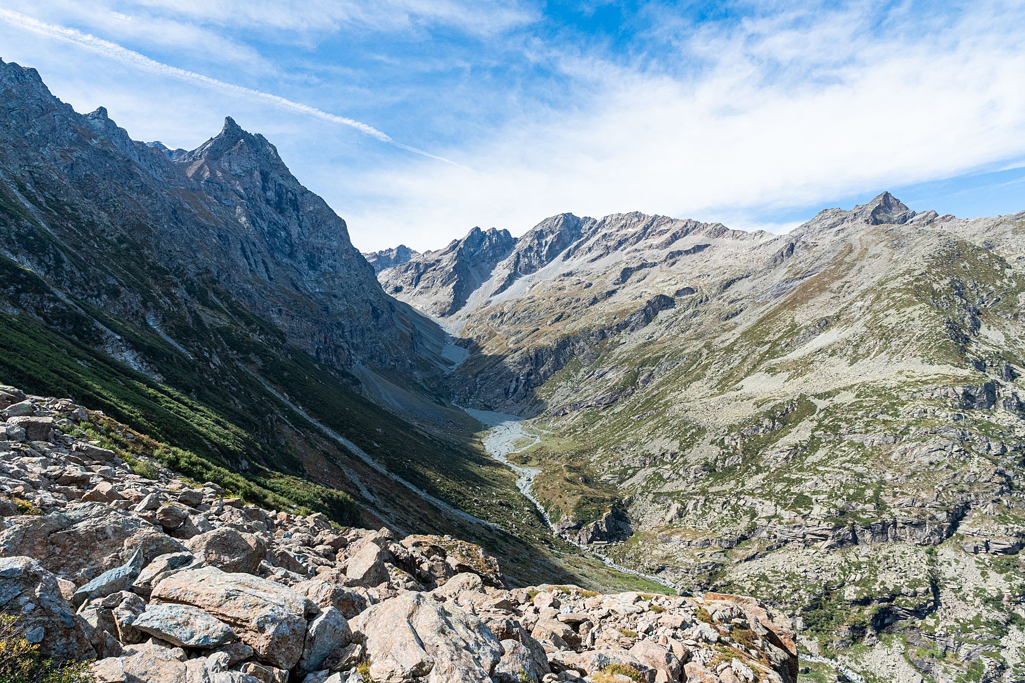 Si percorre il lungo vallone, dove si possono ammirare le pareti granitiche su cui si è sviluppato il movimento alpinistico del Nuovo Mattino, percorrendone il lato sinistro idrografico fino ad arrivare ad una scenografica piana disseminata da massi.
