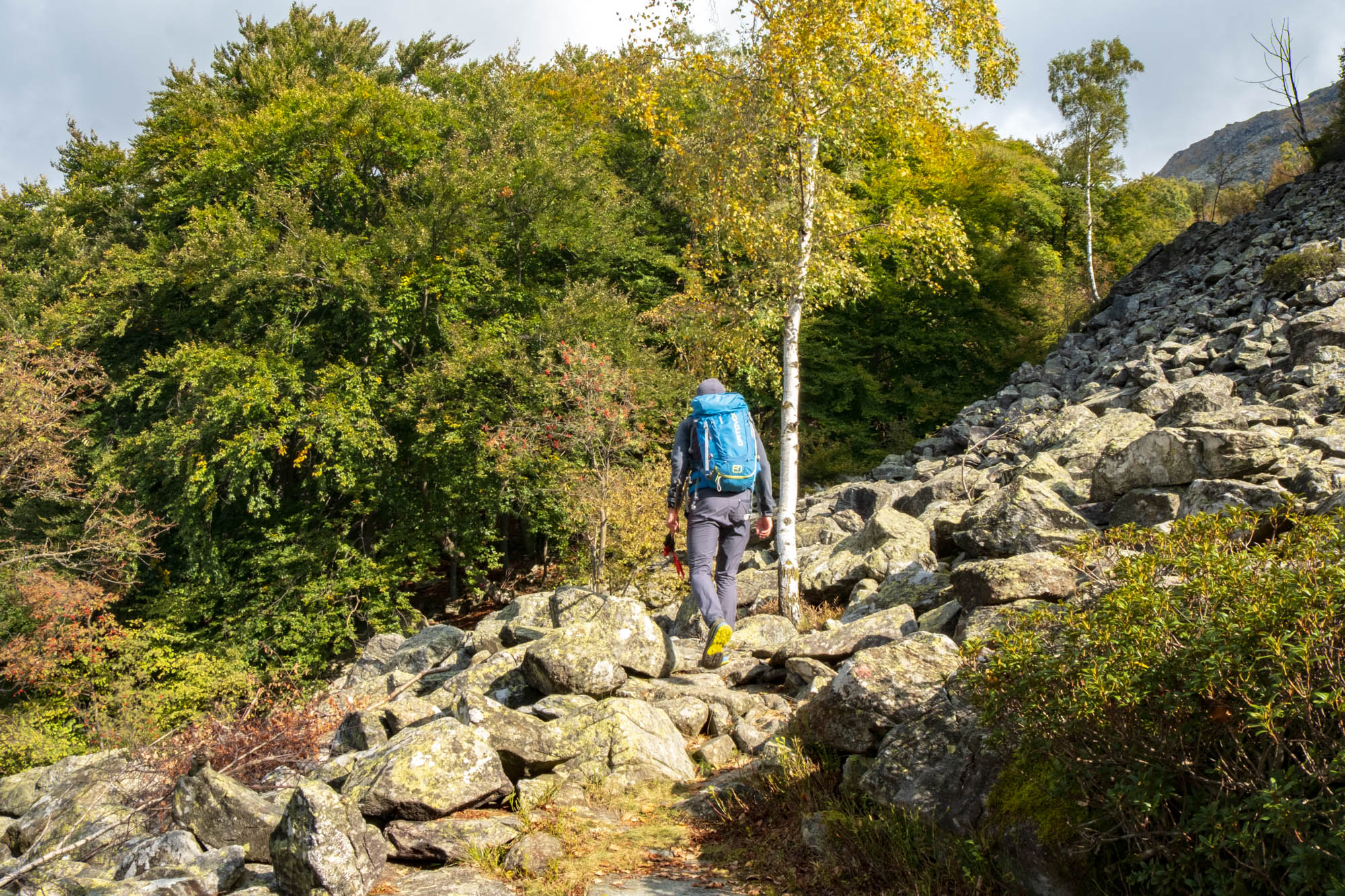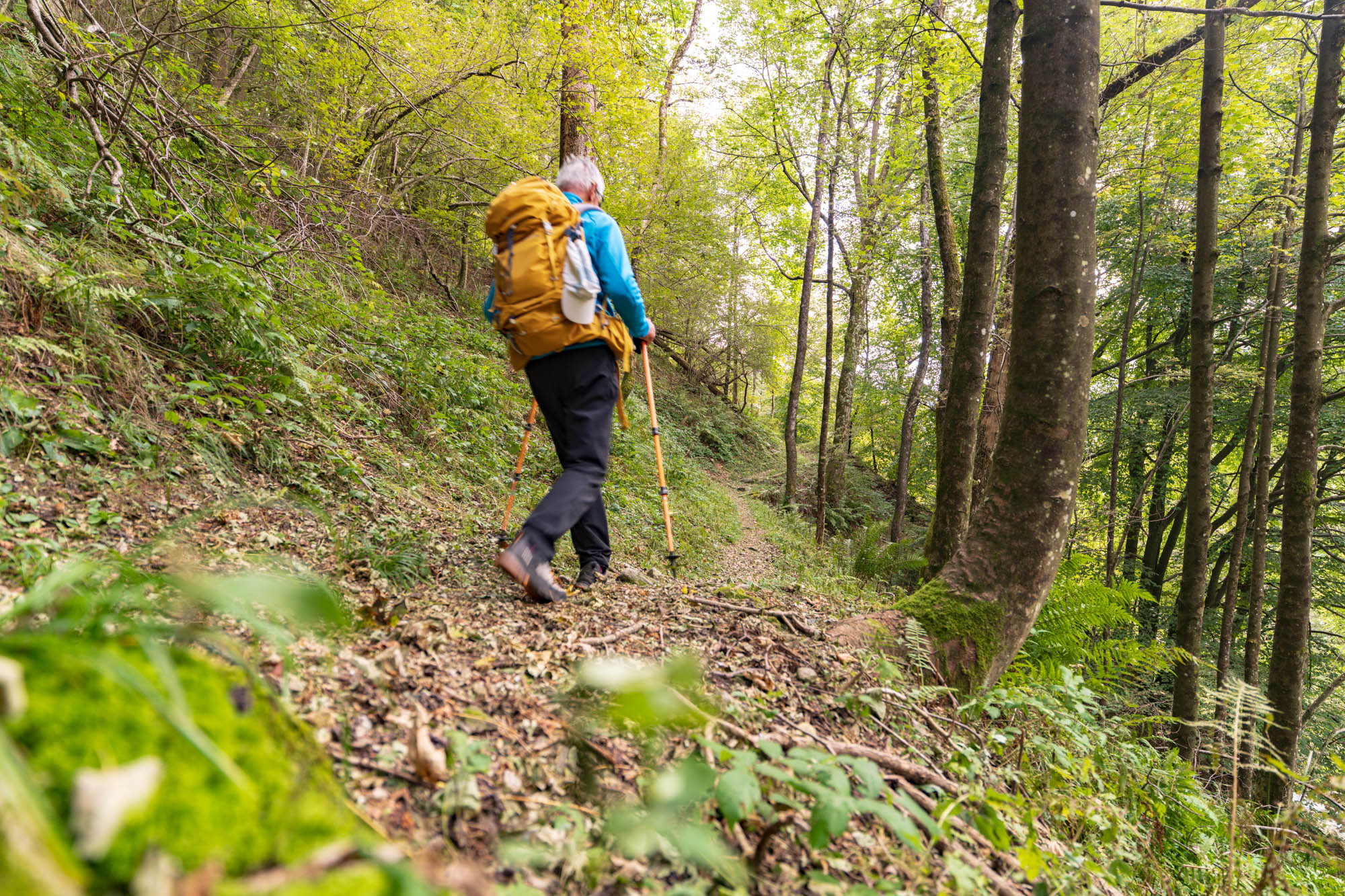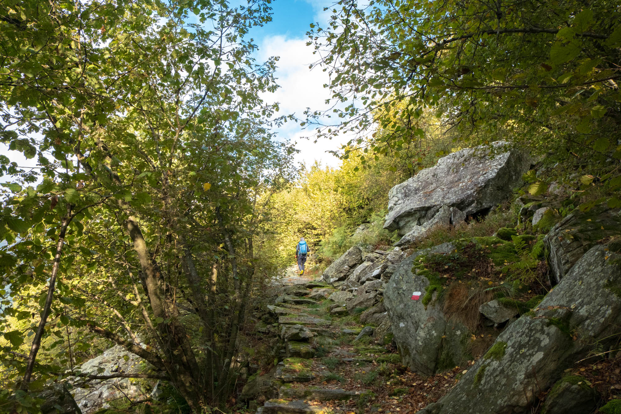 Quando la strada si biforca (palina) mantenere la sinistra per poi entrare sempre su asfalto tra le case della parte superiore della borgata. Nei pressi di una fontana prendere a sinistra una scalinata che presto diventa un sentierino appena accennato (ma sempre ben segnalato con tacche bianco-rosse) che entra in una cupa faggeta. Il percorso attraversa una radura, sale verso alcuni ruderi, attraversa una zona acquitrinosa e supera un piccolo rio. La salita continua ripida con numerosi zig-zag all’interno di un bosco misto.