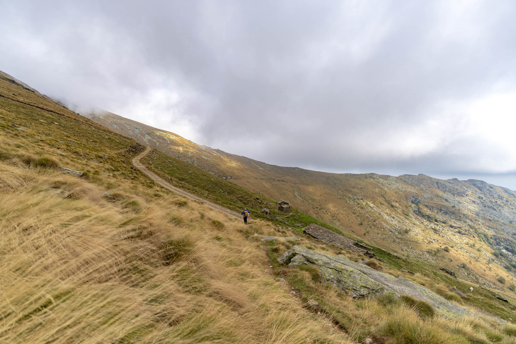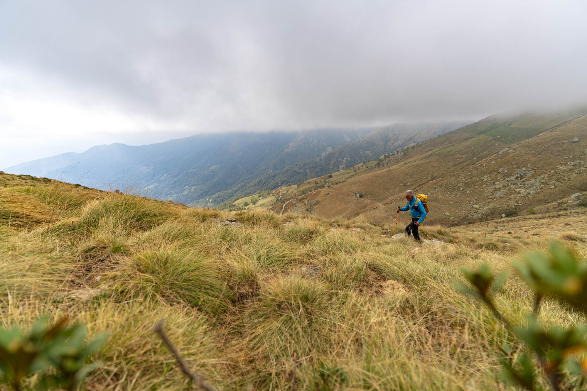 Ridiscendere all’alpe Rossolo e proseguire dritti sull’ampia e poco pendente dorsale erbosa seguendo gli evidenti solchi. Il sentiero, sempre molto panoramico, si sposta sul versante destro per aggirare un dosso, poi raggiunge un colletto.