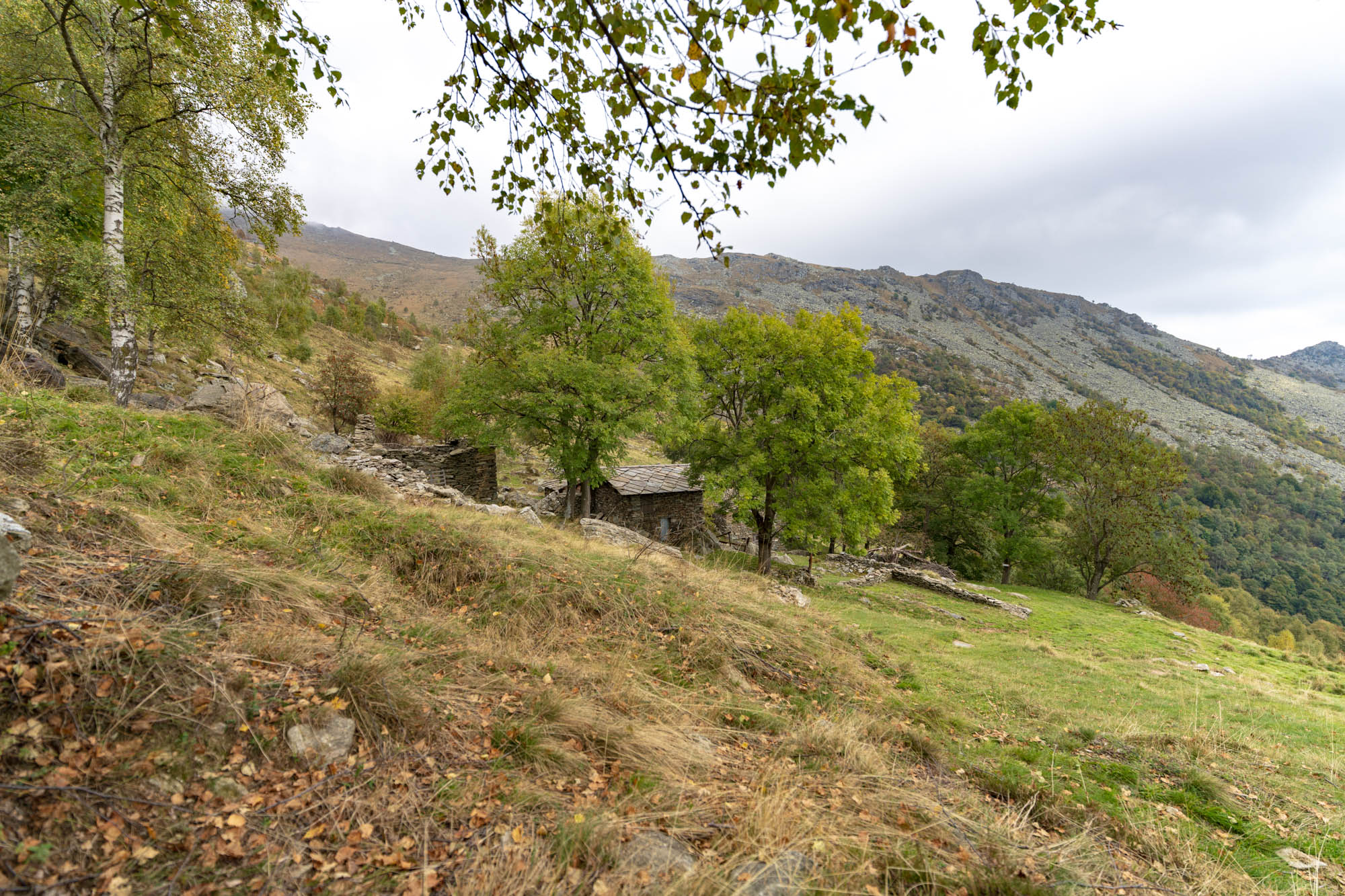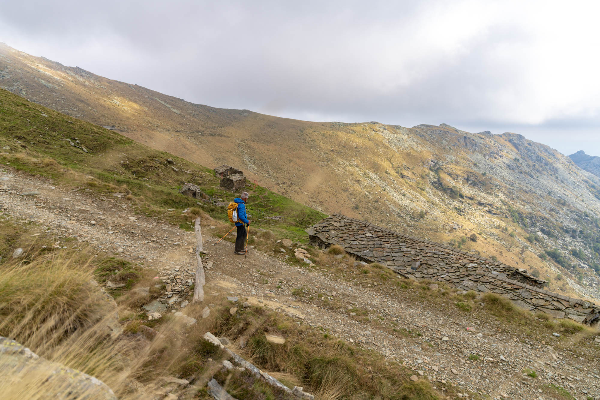 Volgendo a sinistra risalire l’ampia dorsale tra erba e pietre (ometti) con buoni panorami su entrambi i versanti. Ricevuto un sentiero da destra, con un ultimo strappo raggiungere le baite e i ruderi dell’alpe Rossolo (1.937 m).