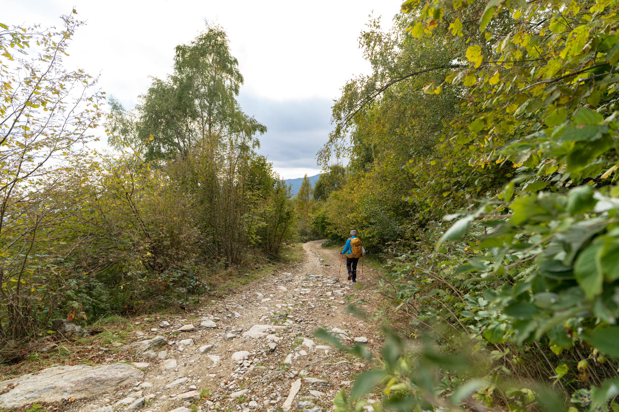 Dal rifugio una scorciatoia conduce alla sottostante sterrata carrabile di accesso. Seguirla verso valle (possibili scorciatoie sempre ben segnalate) toccando diversi alpeggi. Intorno ai 1.600 metri di quota compaiono le prime betulle, mentre al di sotto dei 1.400 m la copertura si fa più fitta, con un bosco misto a prevalenza di noccioli.