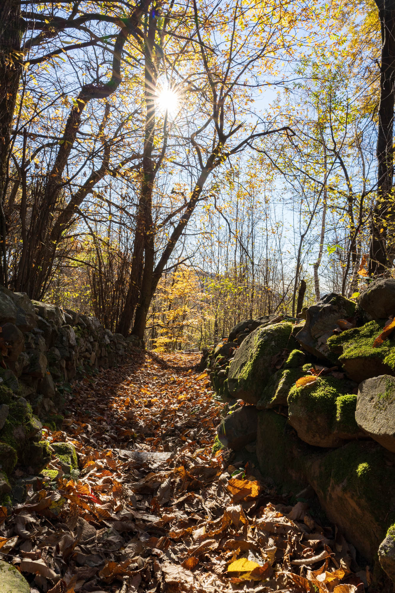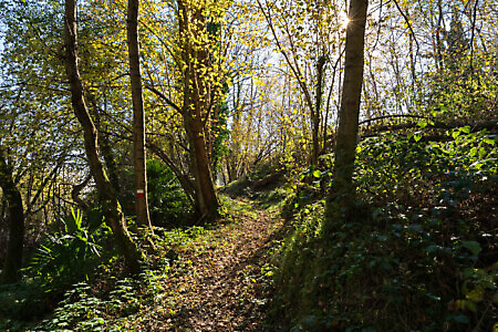 Il sentiero passa sul retro delle case per poi infilarsi in un bosco misto. Superato un rio affianca un tavolo da picnic e prosegue in leggera salita tra castagni, faggi e betulle in parte delimitato da muretti a secco.