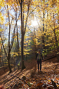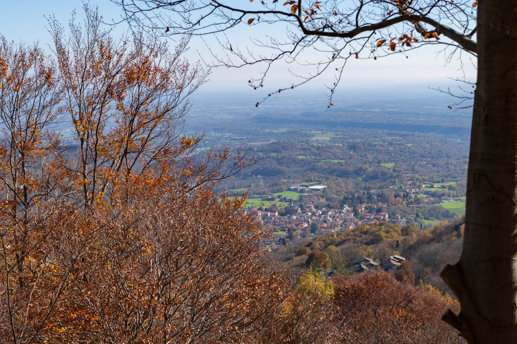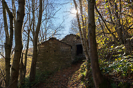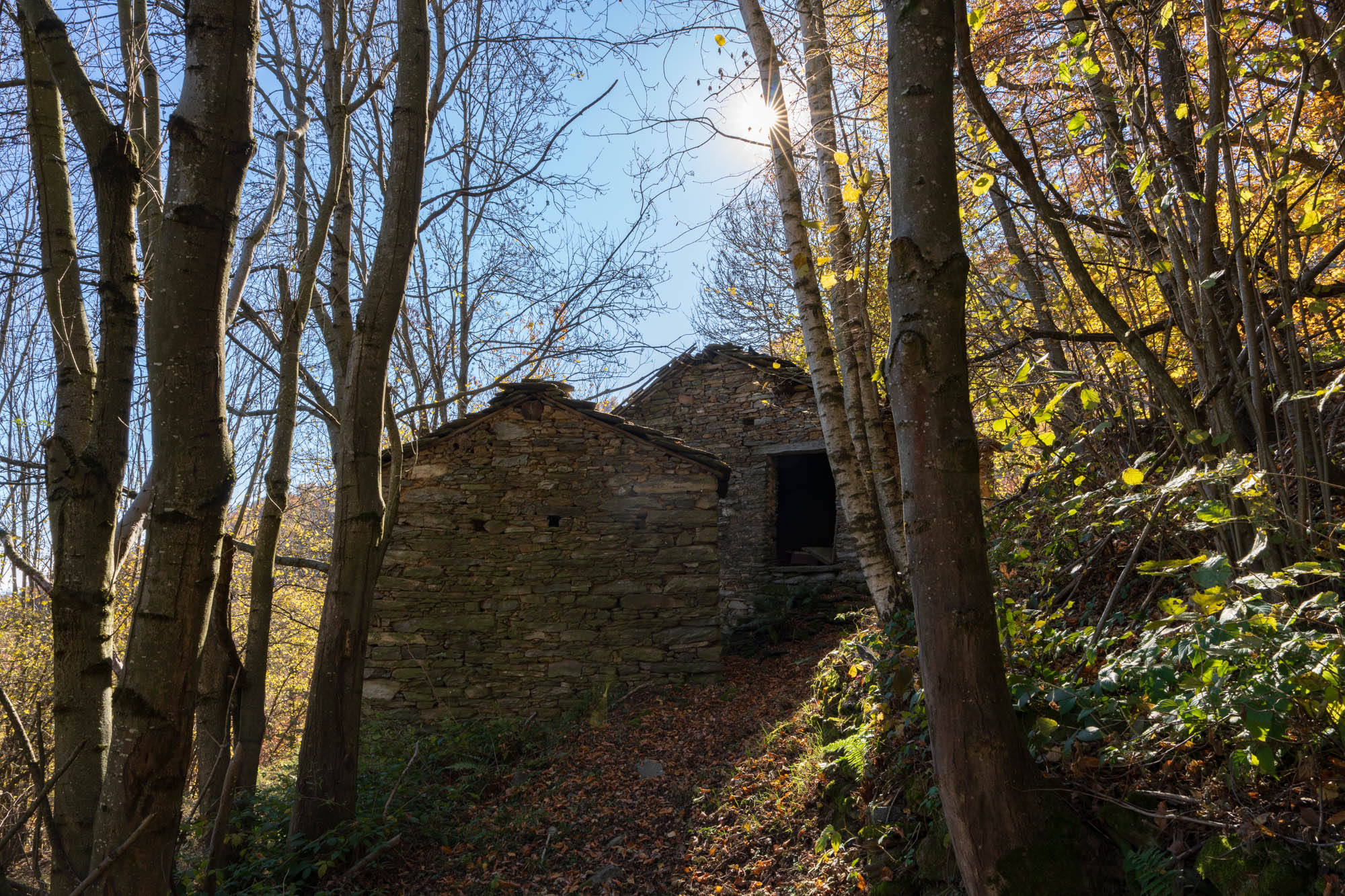 Seguirla in salita verso sinistra attraversando un bosco a prevalenza di faggi. Il sentiero scende a superare un impluvio per poi salire verso le case Osella (971 m), punto di massima quota dell’itinerario, precedute da una coppia di ruderi.