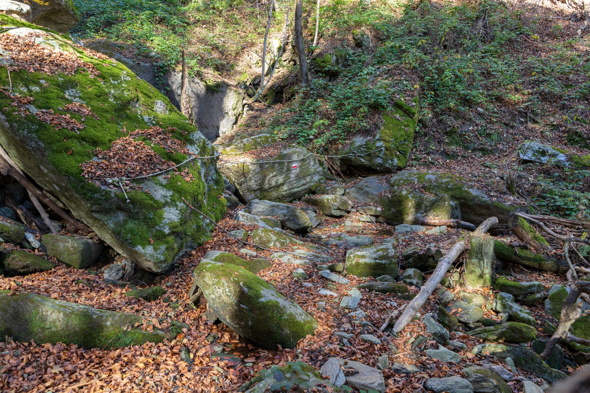 Proseguendo verso valle si lascia l’asfalto per una sterrata semipianeggiante che si stacca a destra. Prima che questa termini presso le case Coletto, prendere a sinistra una mulattiera. Dopo quattrocento metri si passa ai piedi della losera già vista dall’alto delle case Osella, che può essere ammirata con una breve deviazione.