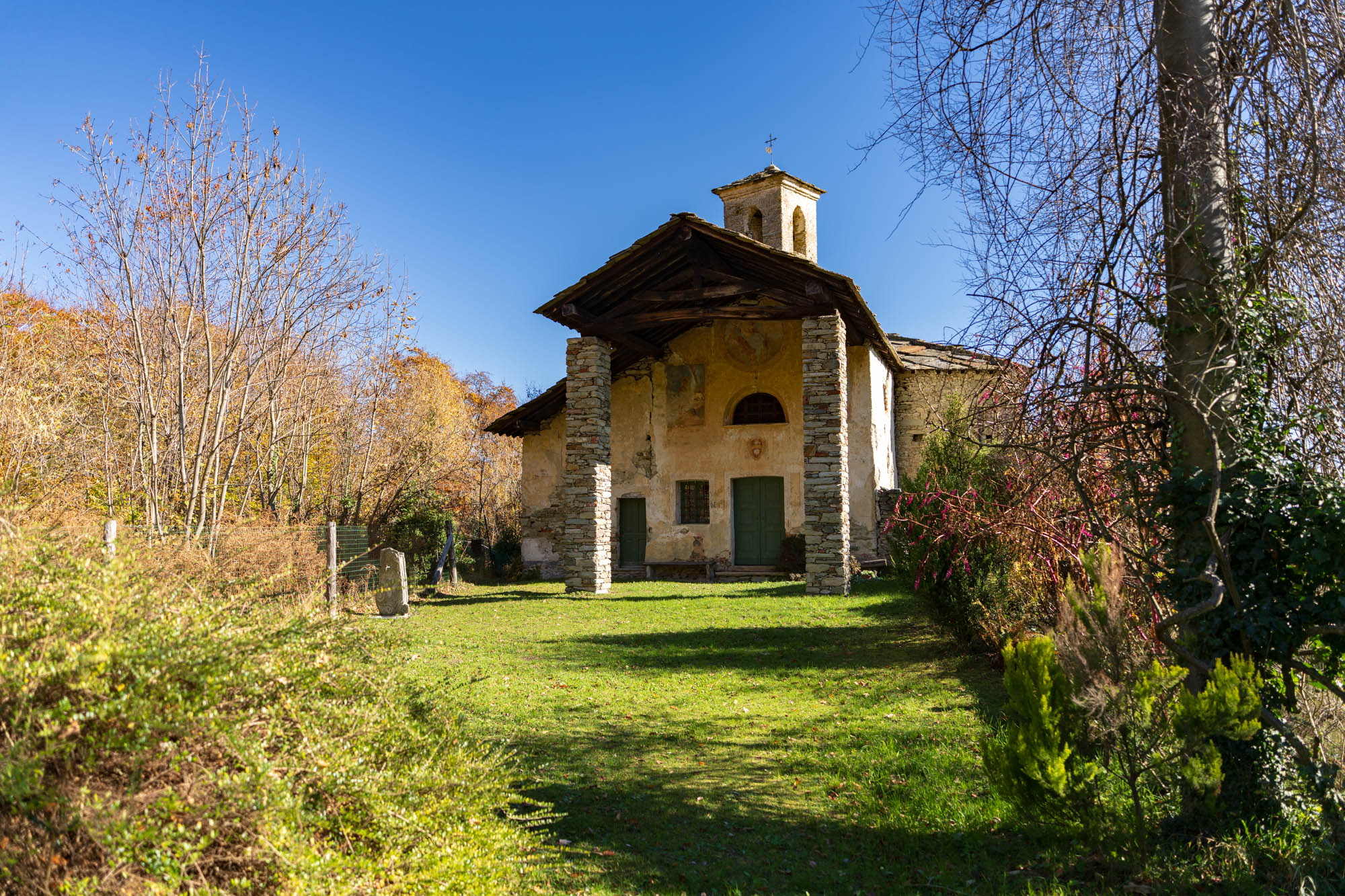 Oltre la borgata scendere verso un impluvio attrezzato con corda (superflua in caso di terreno asciutto), dopo il quale si procede a saliscendi raggiungendo la borgata Pichin, dalla quale si può prendere la stradina asfaltata di accesso o la mulattiera che ne taglia un tornante. I due tracciati si ricongiungono nei pressi di un pilone votivo, dopo il quale si raggiunge la cappella di san Giovanni (884 m), dalle origini antichissime e più volte ricostruita nel corso dei secoli, purtroppo recintata.