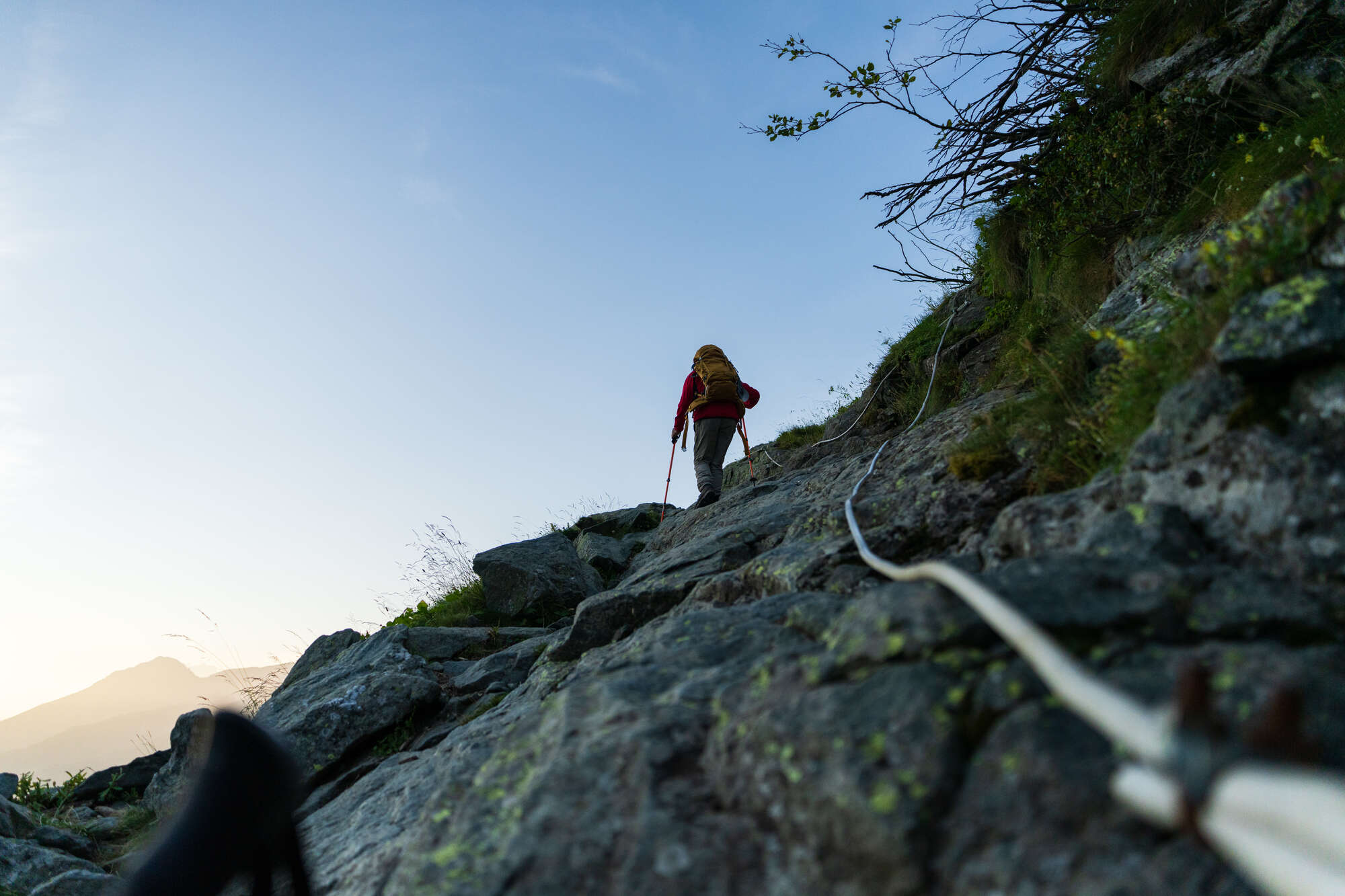 Il tracciato si snoda con numerosi zig-zag guadagnando rapidamente quota. Molto più in alto piega a sinistra, supera una sorta di balma e poi prosegue con un traverso ascendente, attrezzato in un paio di punti con funi in acciaio (normalmente superflue ma che potrebbero rivelarsi utili in caso di rocce bagnate).