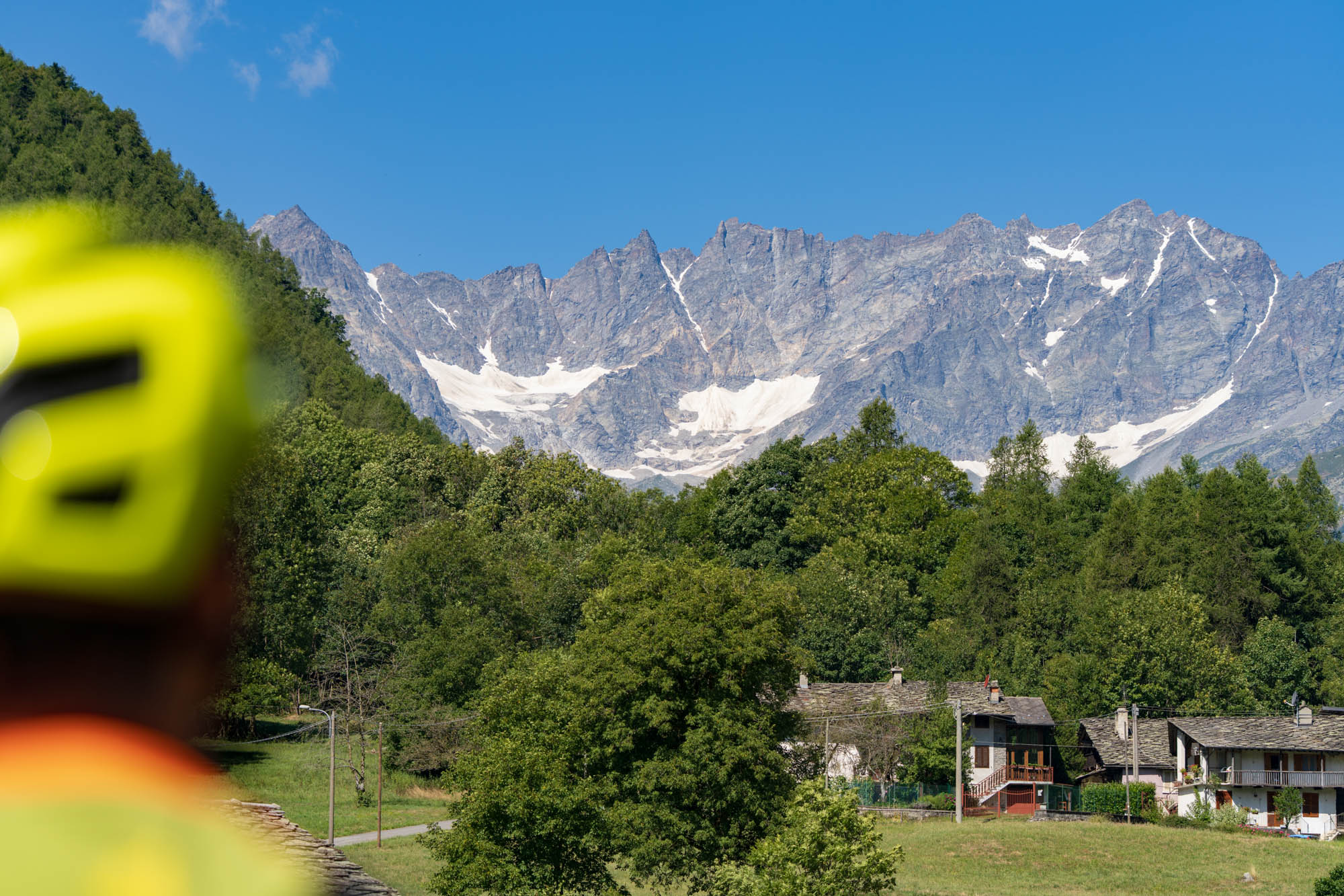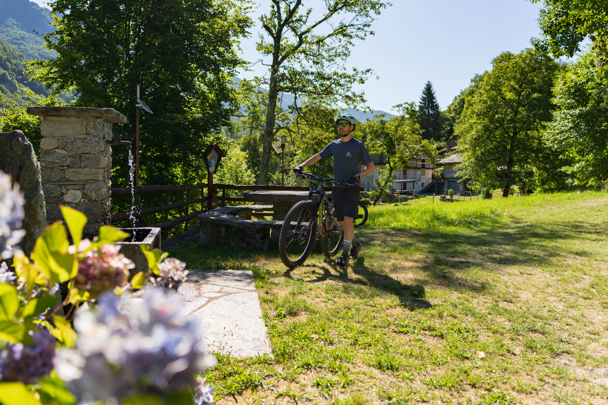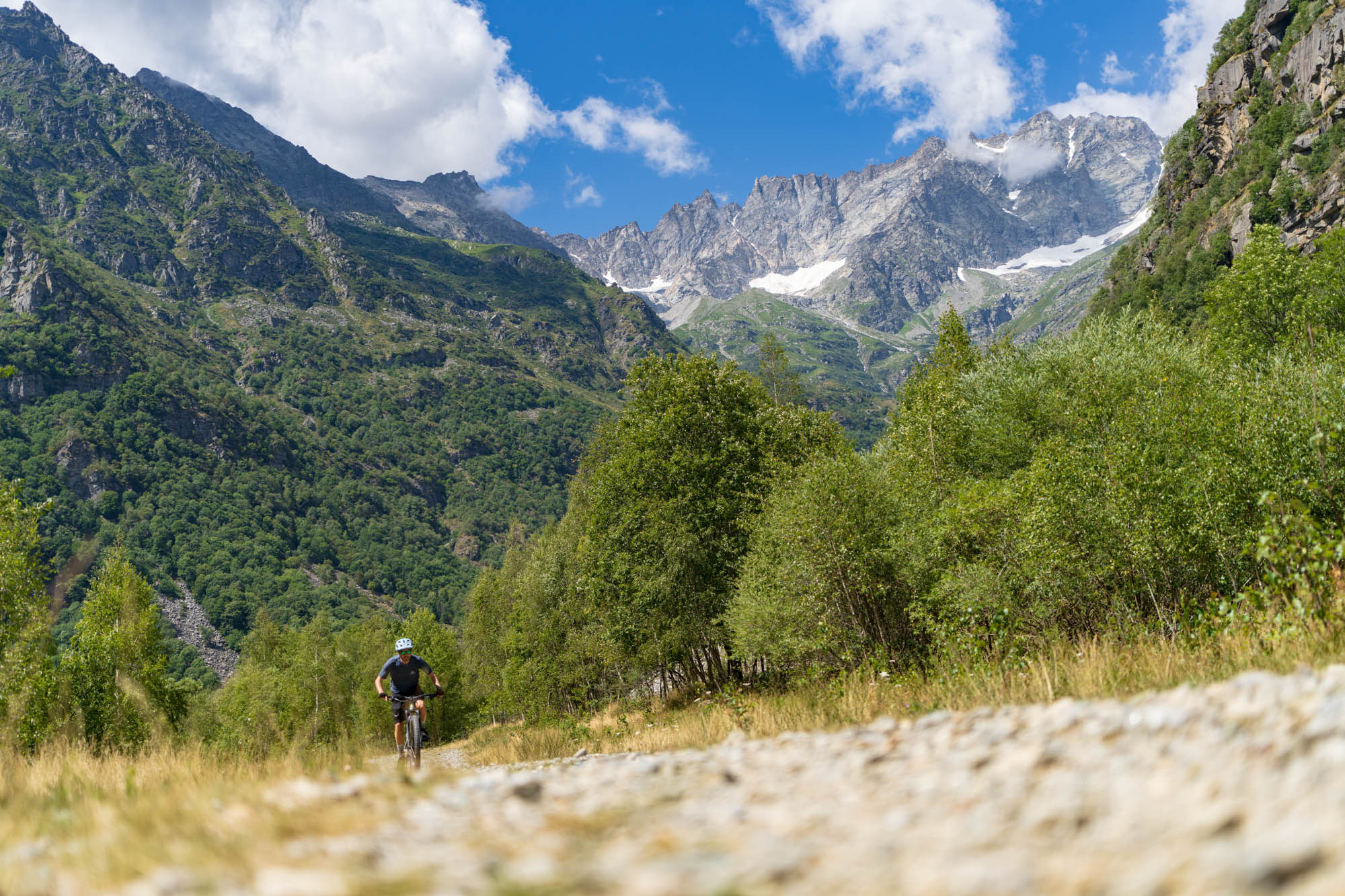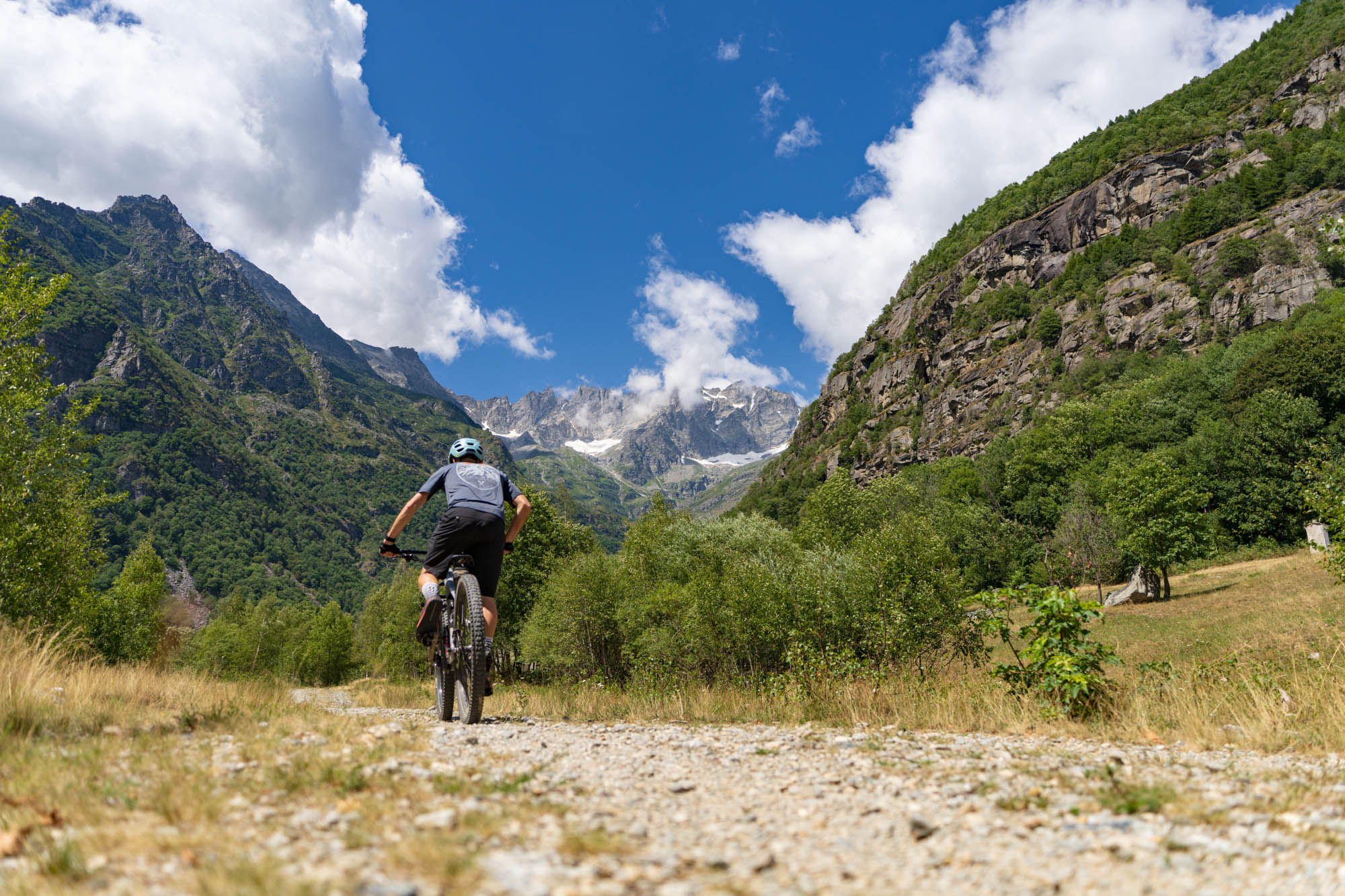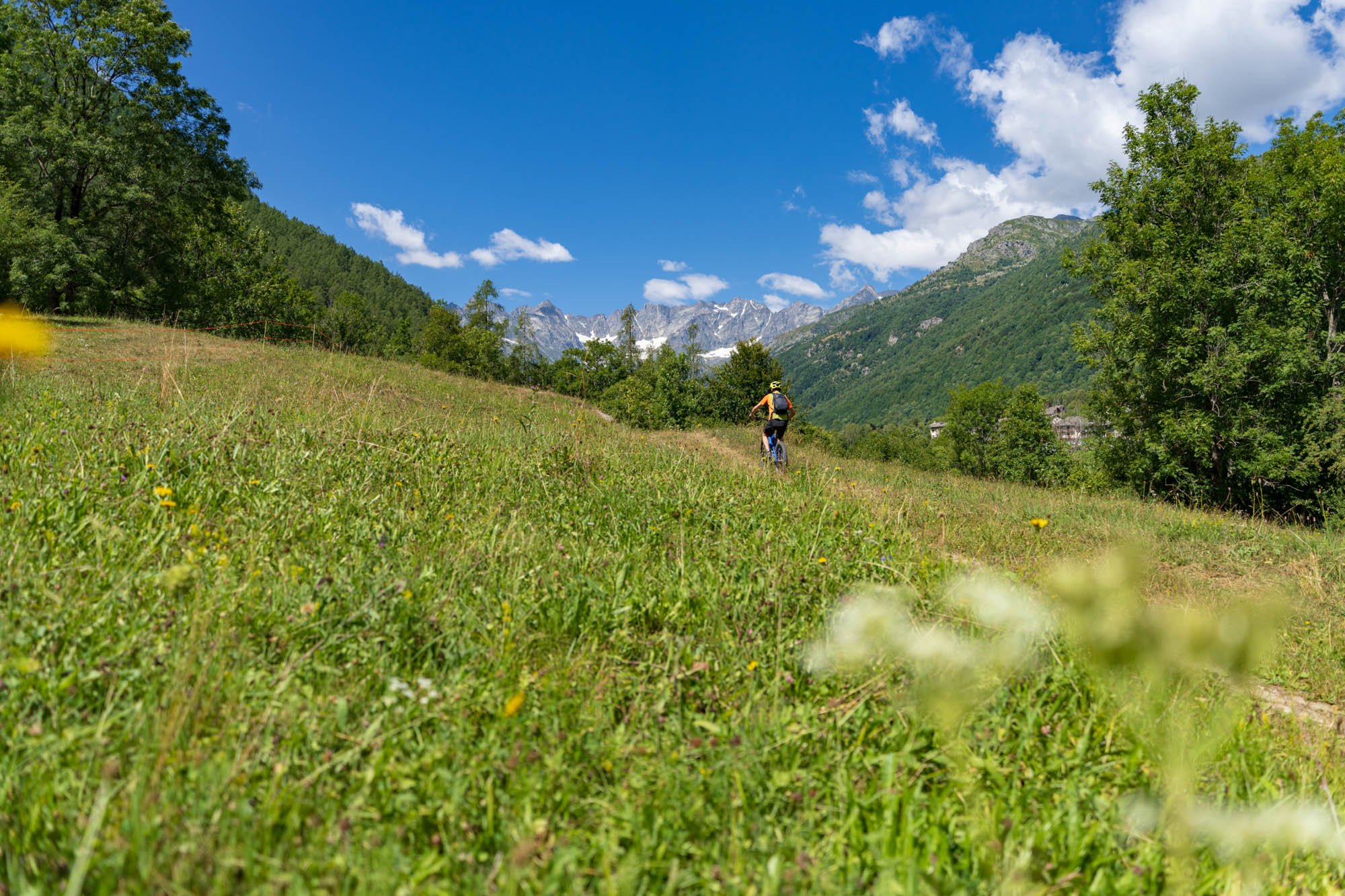 Tornati sul versante sinistro (destro orografico) la sterrata serpeggia tra panoramici pascoli fino alla baita Crouset (1.011 m). Prendere la ripida rampa erbosa alla sua destra che poco più in alto spiana superando su passerella il rio laterale Croset. Attraversare una radura dalla quale si godono di ampie vedute verso la testata della valle. Poco più avanti si incontra un tratto eroso dal torrente dove è necessario spingere la bici per alcune decine di metri. Rimontati in sella affrontare una breve rampa sconnessa oltre la quale si piega verso destra: senza prendere il ponte girare subito a sinistra sulla traccia che presto si restringe a sentiero superando le case del Fontanino (1.058 m).
