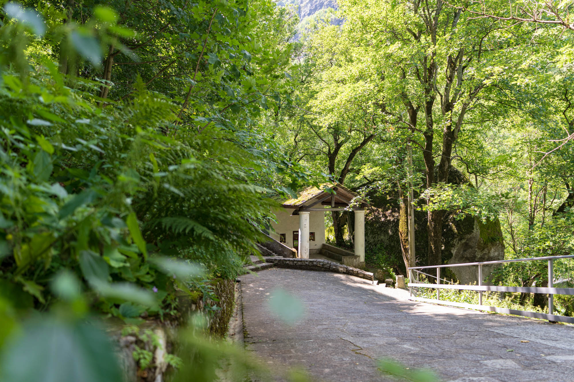 Senza salire verso il paese, costeggiare per un breve tratto il torrente lungo una strada sterrata che poi diventa una ripida rampa cementata che sale a fianco di una centrale idroelettrica. Poco più in alto, dove inizia l’asfalto, svoltare a sinistra passando sotto la canalina che la alimenta, per poi passarle nuovamente al di sotto poco più avanti (attenzione a non sbattere la testa in uscita!).
