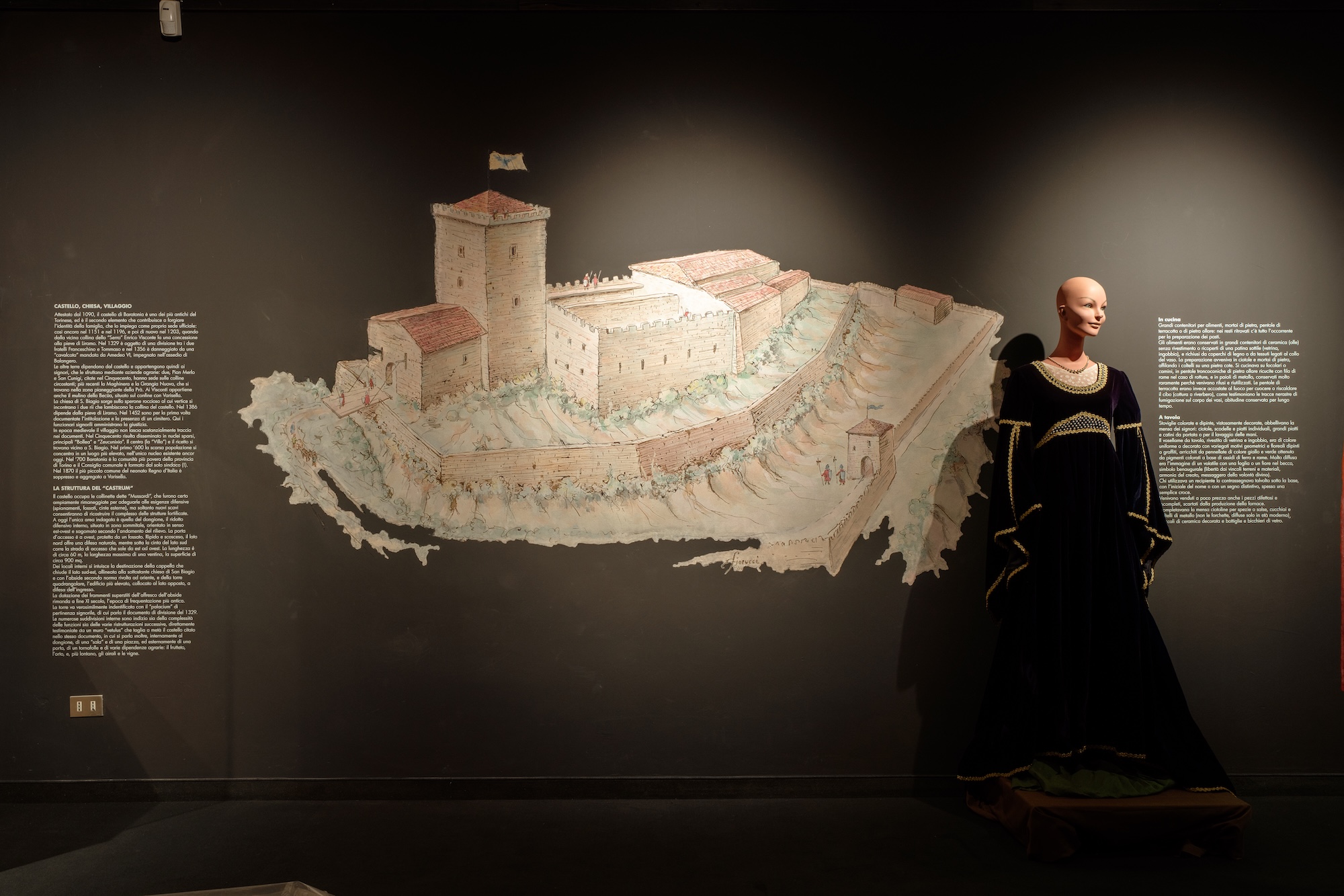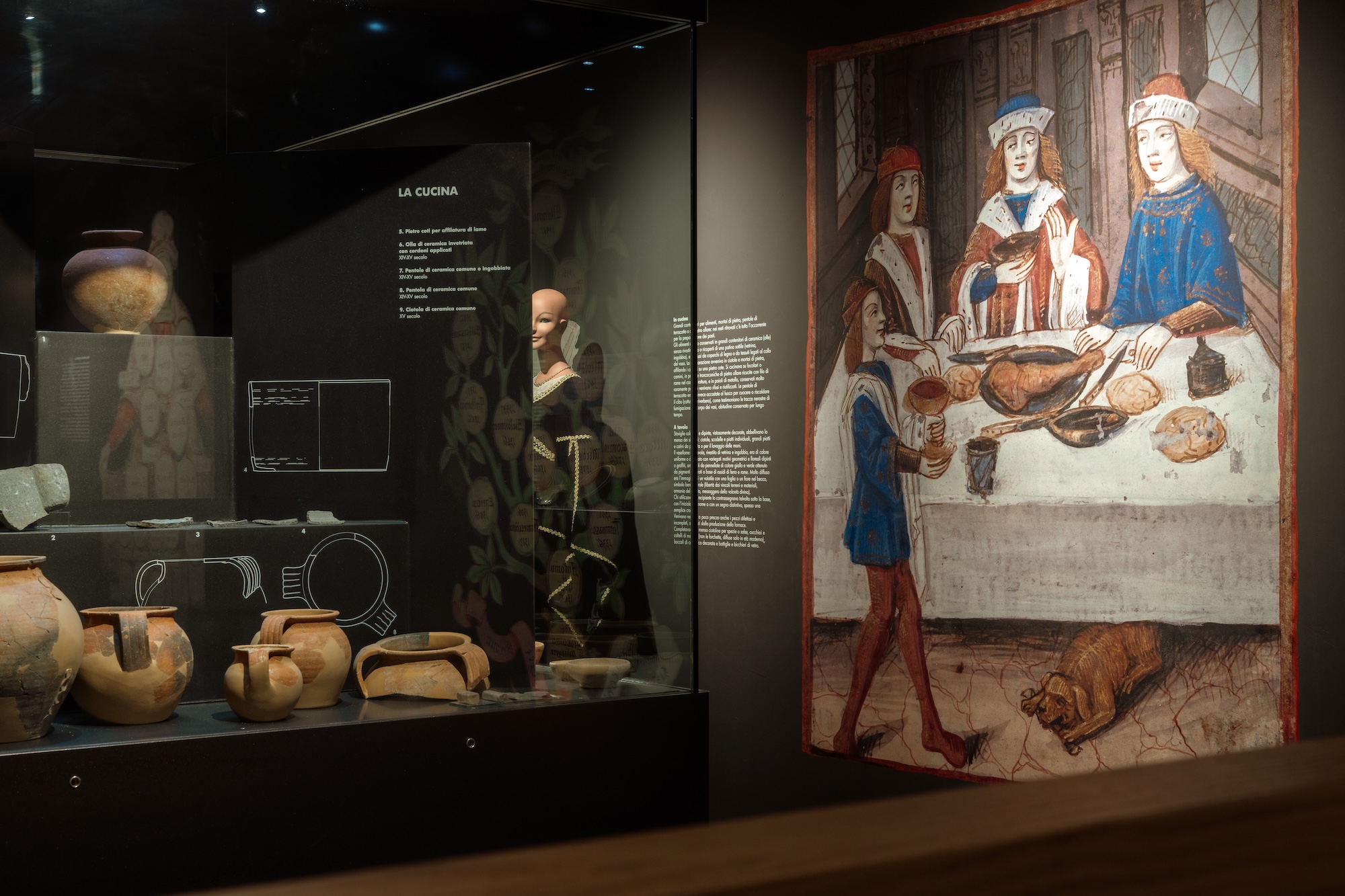 Fra i reperti vi sono: contenitori per alimenti, pentole di terracotta e di pietra Ollare, stoviglie dipinte e decorate in ceramiche policrome del XIV – XV secolo, che abbellivano la mensa dei signori del tempo.