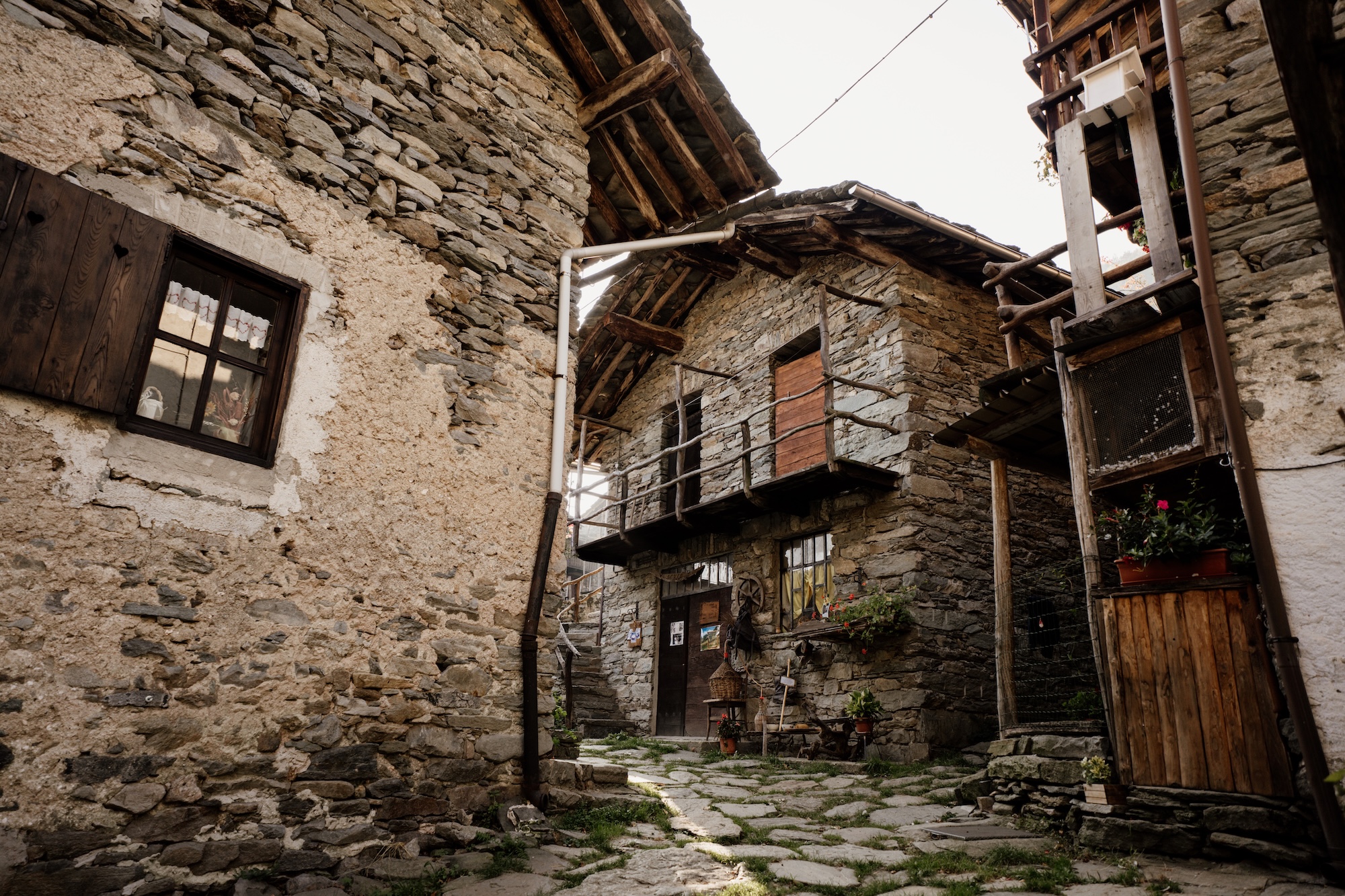 Costruzioni realizzate con materiali locali, dove prevale l’uso della pietra, dalle pavimentazioni dei vicoli alle abitazioni, protette da robusti tetti in lose; alle tante fontane, i bournhèl, sparse nei punti strategici del villaggio, come le pose, strutture realizzate per consentire ai viandanti di appoggiare il carico e riposare.