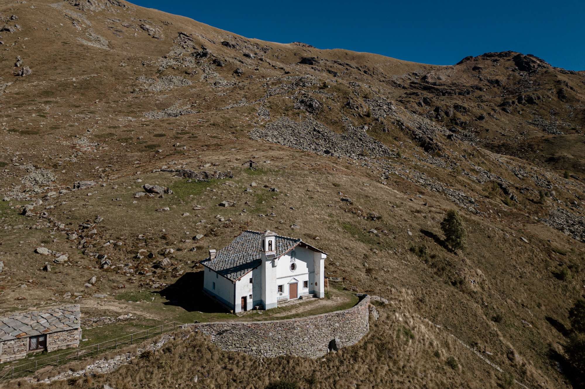 Posto a 1874 metri su una terrazza panoramica che domina la Val Grande, il santuario sorge su un sito di antichissima devozione. La presenza di coppelle e canaletti scavati nei massi suggerisce che la zona fosse sede di culti pre-cristiani. Un luogo dove la pietra racconta storie millenarie.