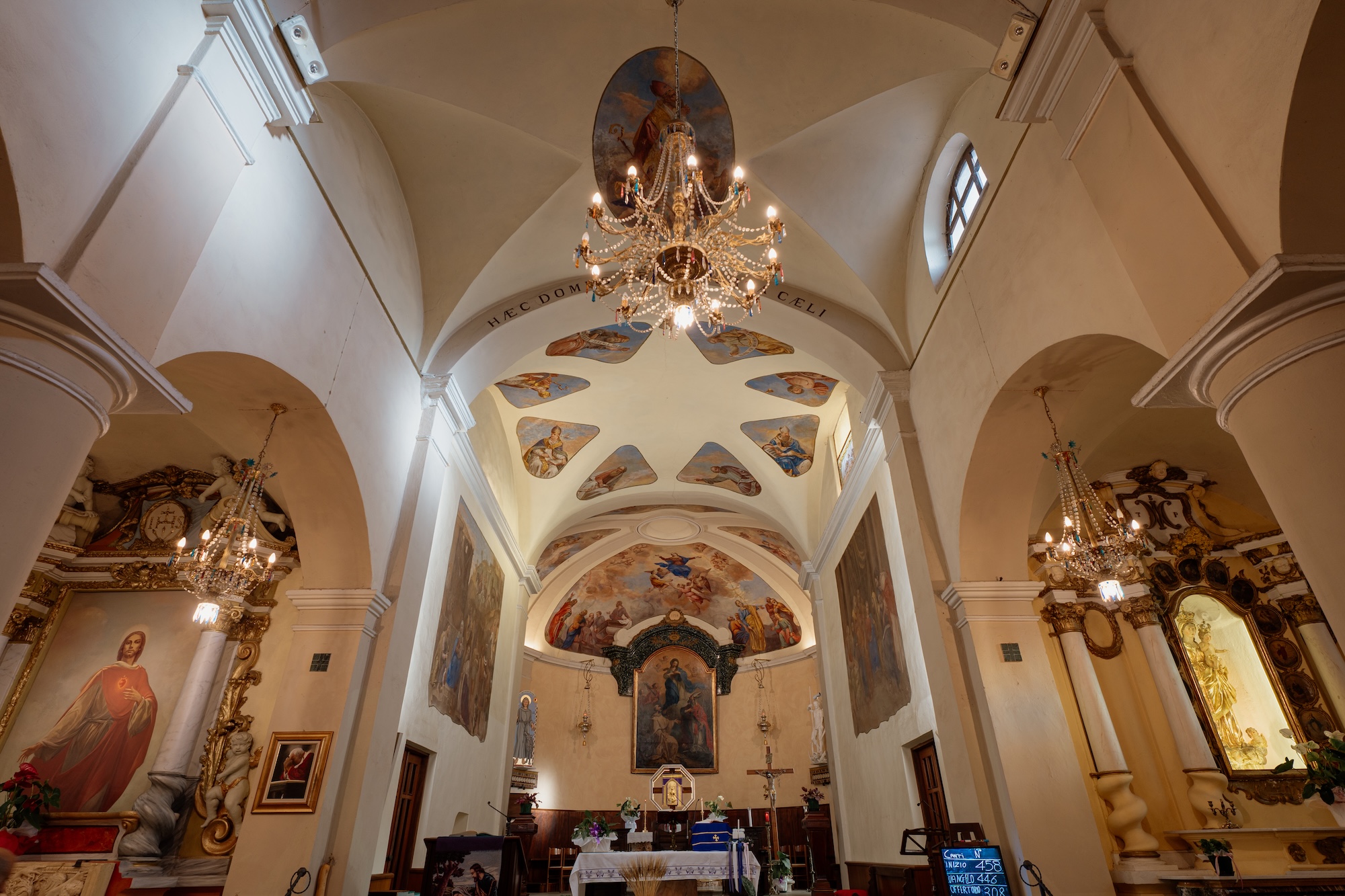 Le navate sono separate da pilastri semicircolari sormontati da archi a sesto ribassato. Il tetto con copertura in coppi, possiede due falde su navata e presbiterio e una falda sulle navate laterali. L’interno ha una pavimentazione a quadroni di marmo sul presbiterio, in graniglia nelle navate, mentre è a tavole di legno nelle cappelle laterali. Volte e catino absidale sono affrescate e tra le pitture spicca quella che raffigura l’Incoronazione della Vergine.