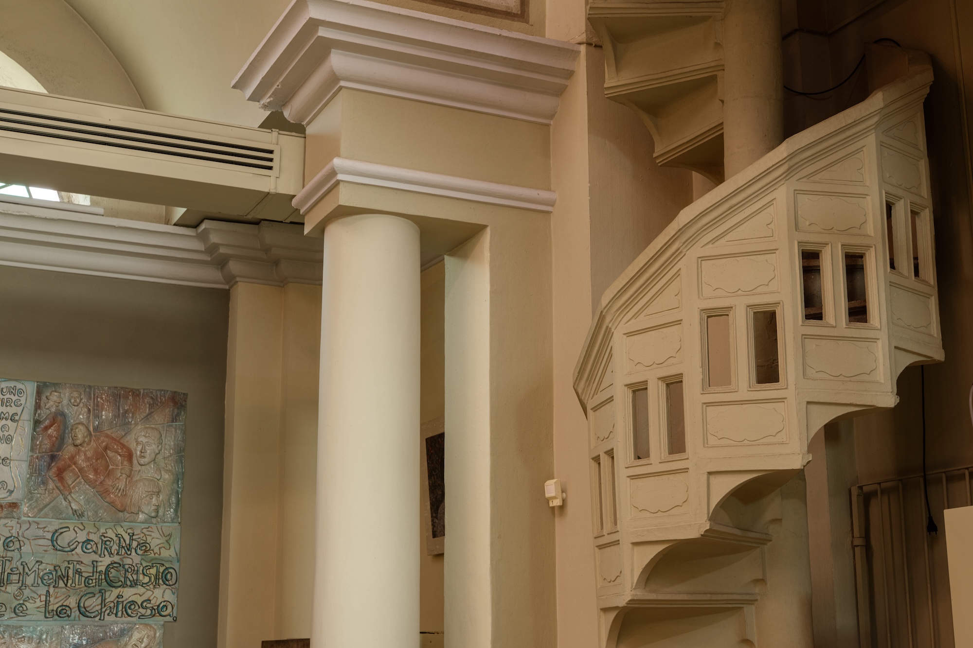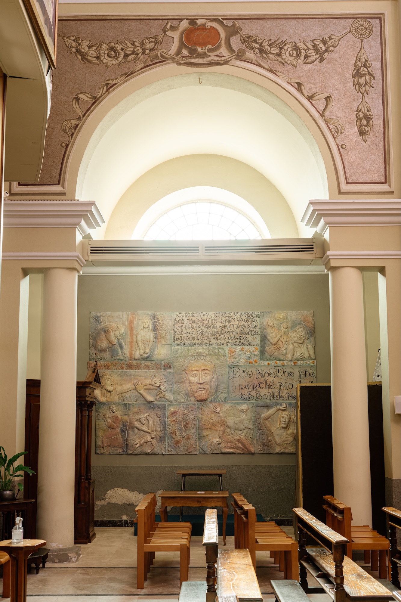 Completa l’impianto abside poligonale. La navata centrale è sormontata da volta a botte ribassata, le cappelle laterali da volte a botte, il presbiterio da volta a botte con unghie e l’abside da semicupola.