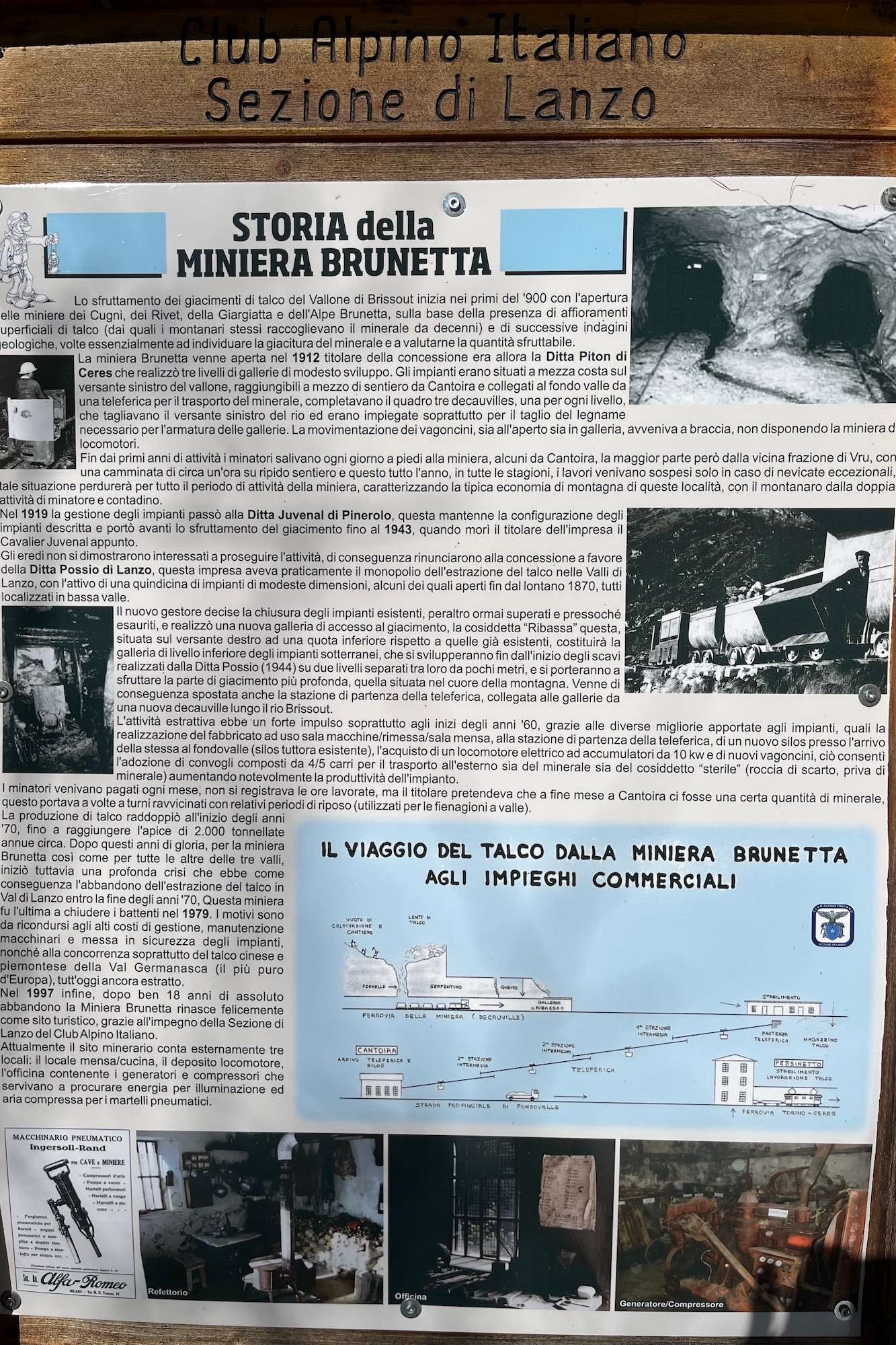 Il museo è stato concepito come esempio di archeologia industriale per recuperare e valorizzare l’importante patrimonio che l’attività mineraria ha lasciato in questo sito oggi in disuso, a 1580 metri di quota. L’impianto della miniera è situato nello stretto Vallone di Brissout ed è raggiungibile unicamente a piedi con quasi un’ora di cammino partendo dalla frazione Vrù di Cantoira. Si tratta di un piccolo insediamento per l’estrazione del talco, in attività da inizio Novecento fino al 1979. Il museo, allestito e curato dal CAI di Lanzo, comprende le strutture esterne e una rete di gallerie lunga circa tre chilometri, articolata su due livelli. Le galleria sono state mantenute nelle condizioni originarie. Dall’esterno sono visibili la sala minatori, che ospita materiali e vettovaglie d’epoca, la rimessa del locomotore elettrico e la sala macchine.
