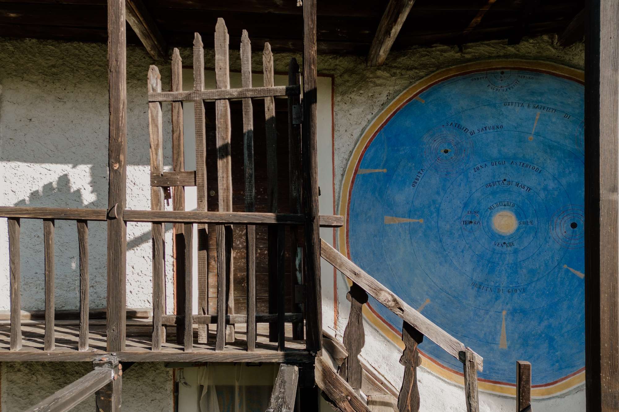 Lasciatevi guidare dal sole in un itinerario che parla di fede e ingegno. Il viaggio inizia davanti a un disco d'argento che cattura la luce, la prima di nove tappe dedicate al tempo solare. Lungo il sentiero, gli affreschi tardo-cinquecenteschi del Perini emergono dalle facciate come preghiere dipinte, creando un legame indissolubile tra il cielo sopra le cime e la storia degli uomini che hanno abitato queste valli.