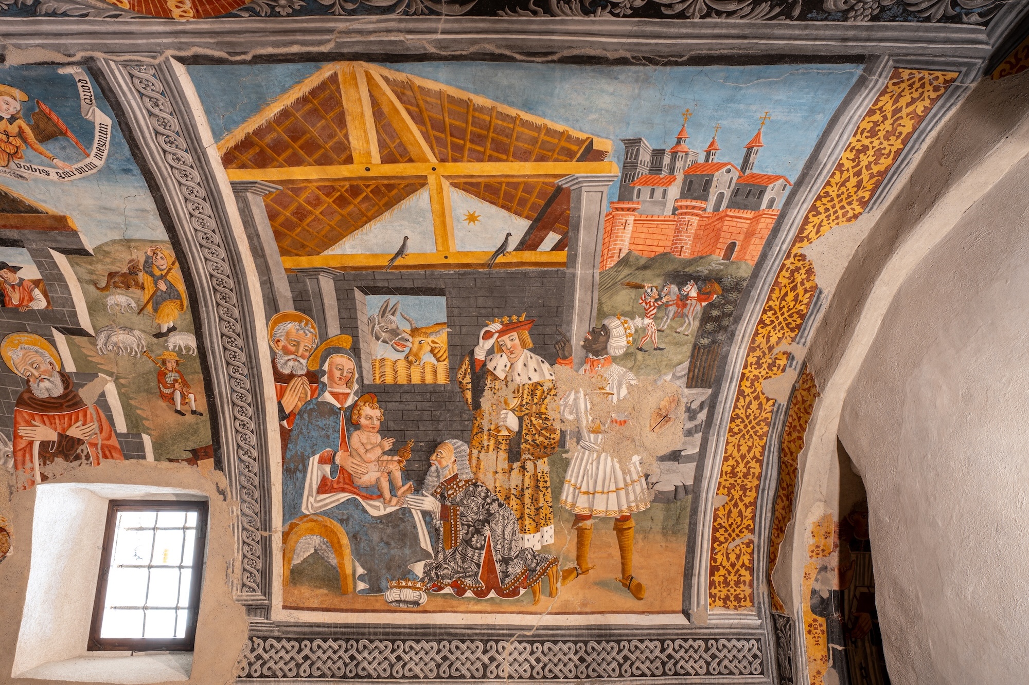 La volta è decorata con scene della Vita di Maria e di Gesù: sulla destra, la Natività e l’Adorazione dei Magi, animate da dettagli realistici come pastori, animali e un servo che trattiene cavalli.