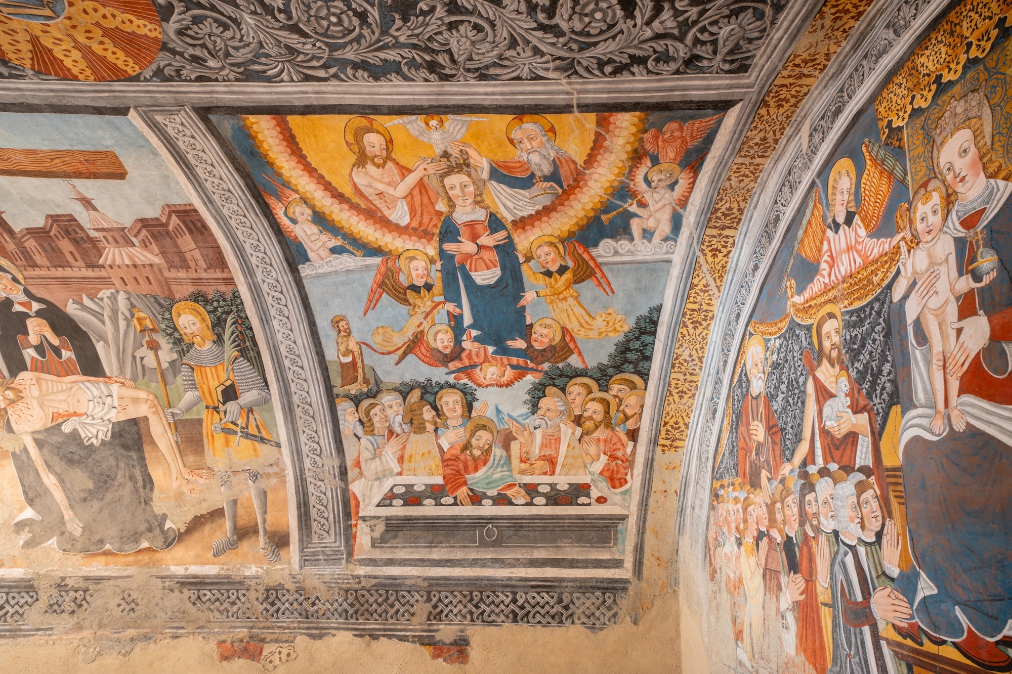 La mostra offre uno spaccato della cultura e delle attività del territorio, con strumenti agricoli, utensili domestici, abiti tradizionali e altri reperti che raccontano le usanze e il lavoro delle comunità locali. L’esposizione intende valorizzare la memoria storica e il legame con l’ambiente naturale e rurale della zona. “Il ciclo di affreschi dell’oratorio della Confraternita del SS. Nome di Gesù, realizzato nel 1546 per volontà dei membri della Confraternita della Vergine Maria, decorava originariamente una piccola chiesa poi inglobata nella struttura attuale tra il 1892 e il 1894. Sull’altare è raffigurata la Beata Vergine con due angeli alle spalle; accanto a lei si trovano san Giuseppe e san Giovanni Battista (a sinistra), san Michele e san Sebastiano (a destra). Sotto, i confratelli in preghiera, tra cui i membri della famiglia Goffi, committenti dell’opera.