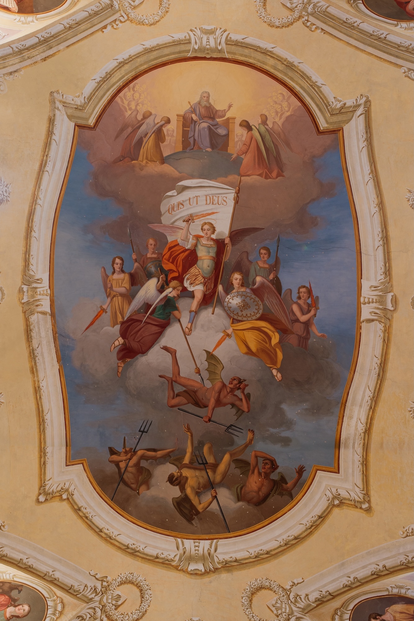 San Michele pesa le anime e trafigge il demonio, mentre un santo martire, vestito da guerriero, regge simboli del martirio e una lampada processionale. Nell’Assunzione della Vergine, l’affollamento di figure comprime visivamente la Madonna, togliendole slancio ascensionale.