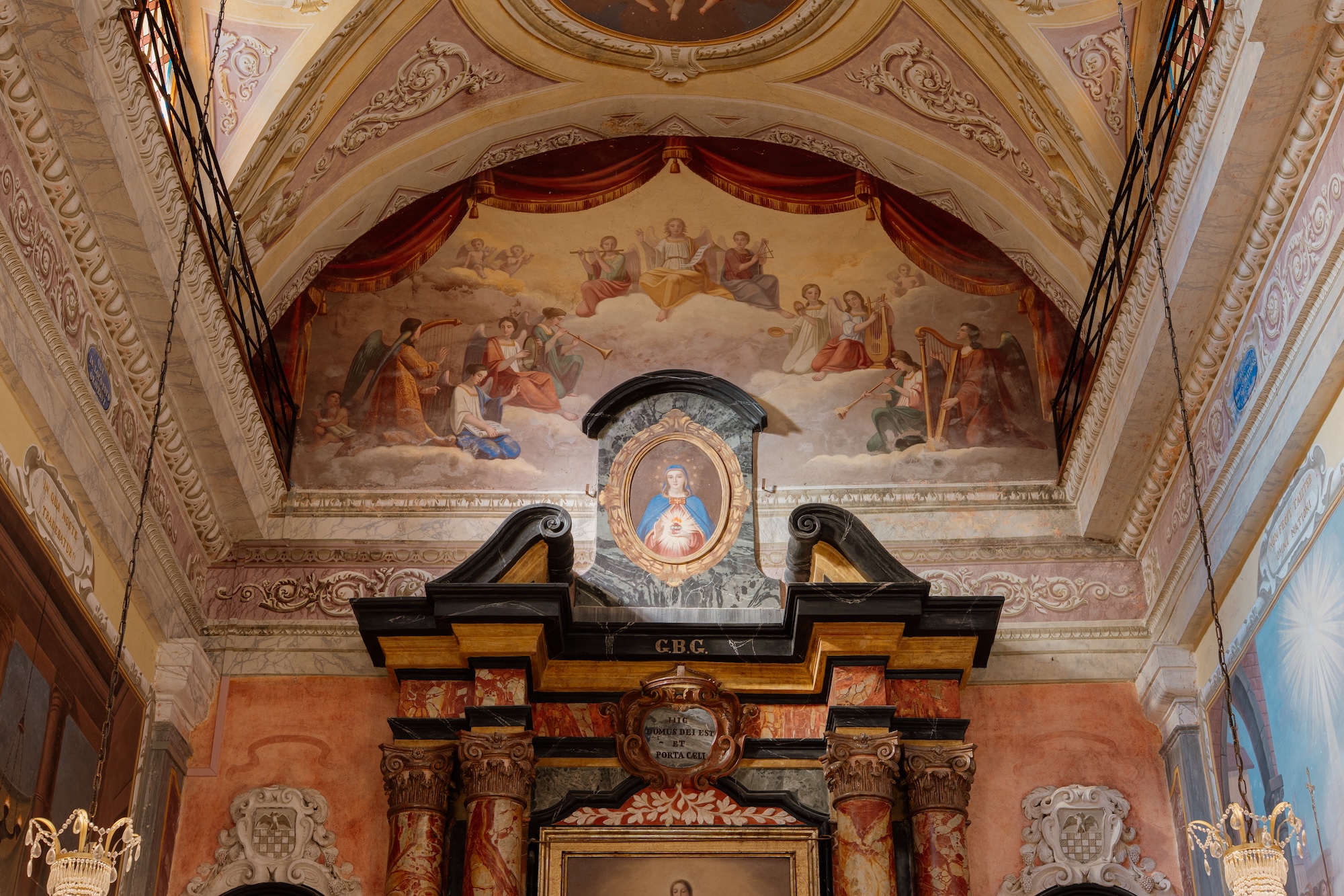 Durante i restauri, è emersa una figura di San Bernardo di Mentone, raffigurato nell’atto di tenere incatenato il demonio, simbolicamente posto all’ingresso del presbiterio per proteggere lo spazio sacro.”