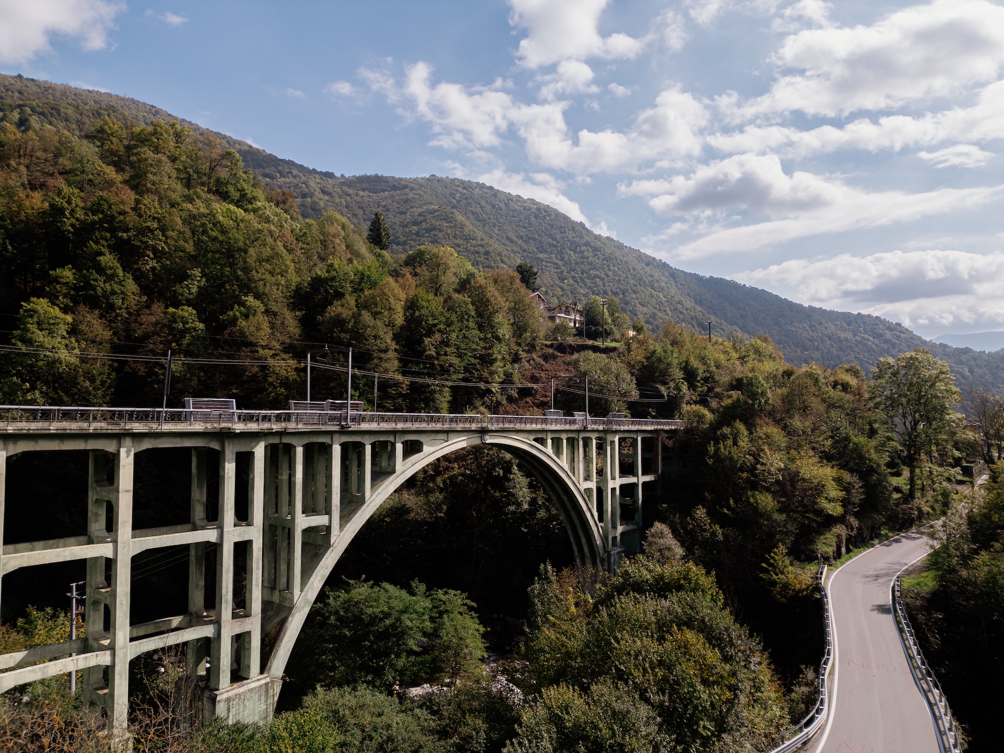 Il ponte ad arco di Ceres sulla Stura di Valgrande, posto appena prima del capolinea (si vede sulla sinistra il segnale di protezione) è senza dubbio l’elemento architettonico più notevole della ferrovia. Il ponte è lungo circa 180 m, di cui 50 coperti dall’arco. Come in tutte le realizzazioni precoci con la tecnica del cemento armato, esso mostra una struttura assai leggera ed elegante.