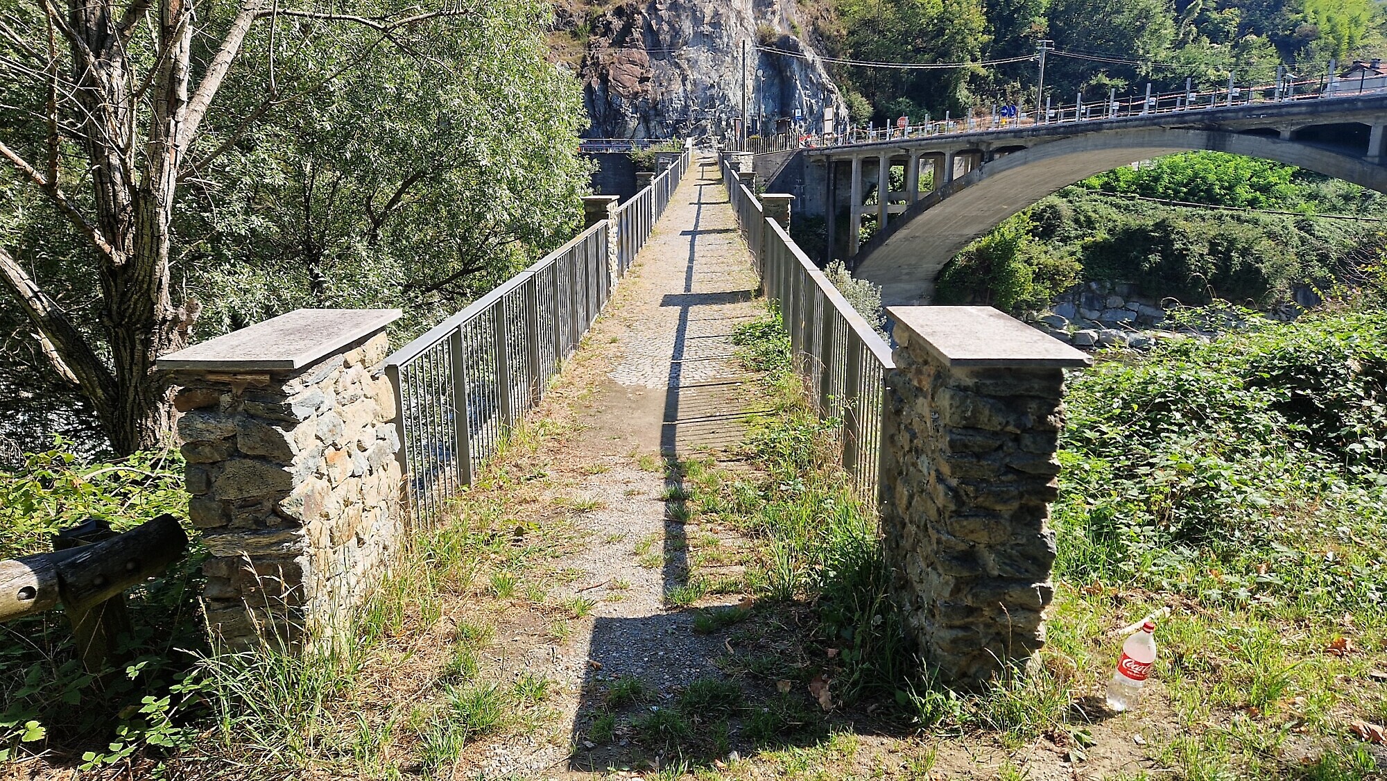 Il ponte in pietra a due arcate irregolari venne costruito nel 1865, risolvendo problemi di accessibilità che avevano afflitto Traves per secoli.
