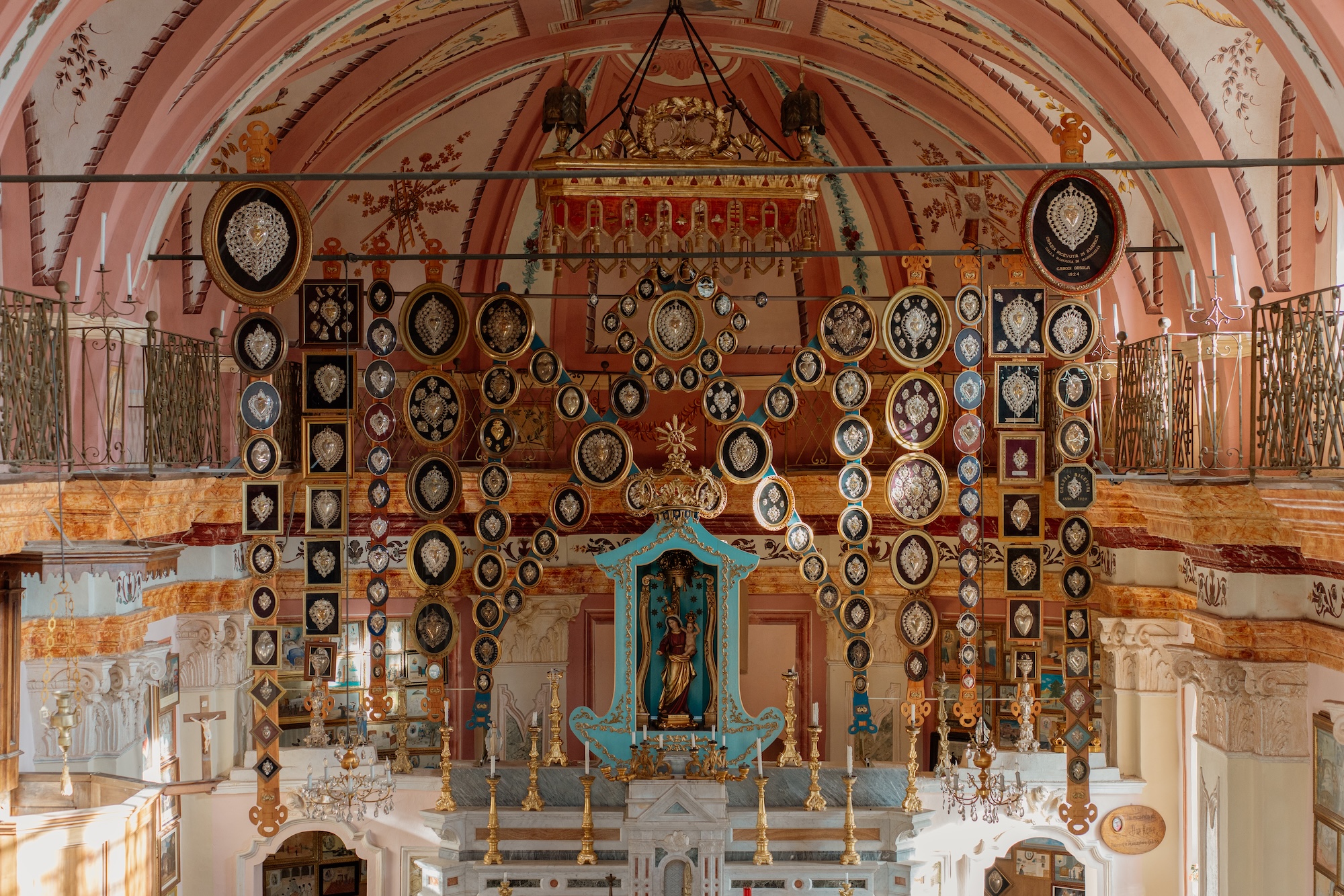 Le pareti sono tappezzate da ex-voto, specchio di una religiosità profondamente legata alla vita di tutti i giorni: realizzati con le più svariate tecniche (dipinti su metallo, su tela e su tavolette di legno) o costituiti da cuori votivi , stampe e oleografie, rappresentano una notevole testimonianza storica e sociale della vallata. Spiccano fra gli altri quelli relativi al periodo bellico compreso fra le Guerre d’Indipendenza e l’ultimo conflitto mondiale. Curioso rilevare che all’interno non esistono altari o cappelle laterali ma solo alcuni confessionali e un pulpito.